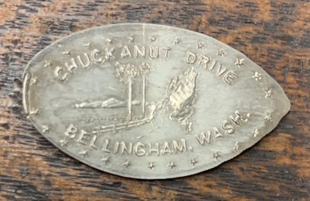 Neat Chuckanut Drive elongated coin, made on a solid nickel foreign coin. Artwork shows a historic view of the famous old 99 highway, starting