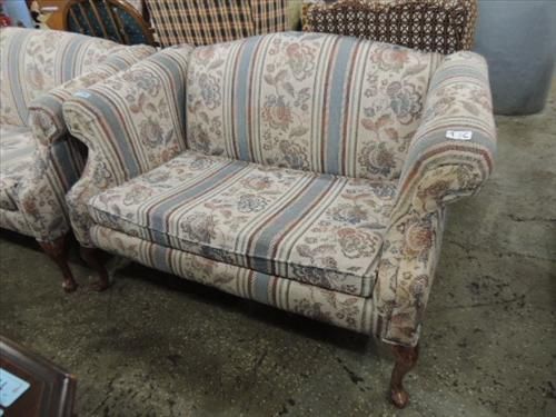 54"L EARLY AMERICAN STYLE CUSHIONED LOVE SEAT. AS SHOWN. VIEW PICTURE FOR DETAIL.