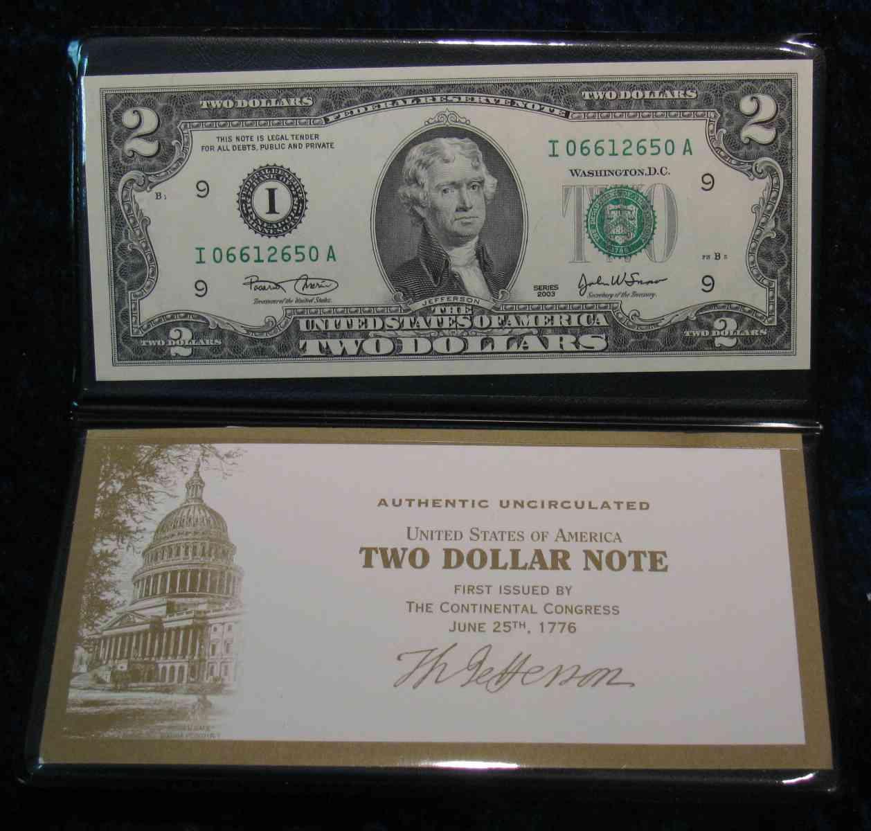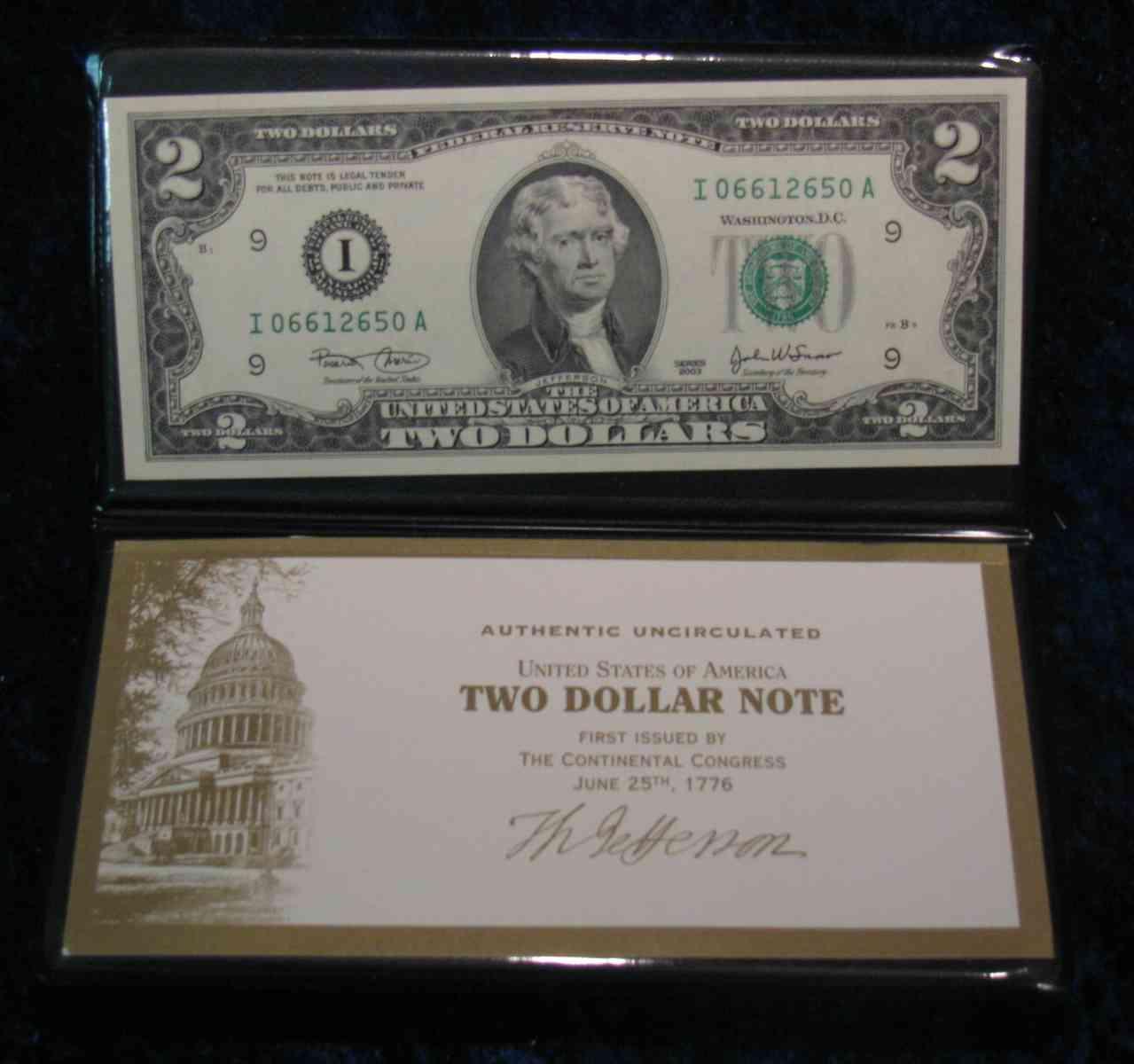 542. Series 2003 Crisp Unc $2 Federal Reserve Note in holder complete with certificate from the U.S. Monetary Exchange.