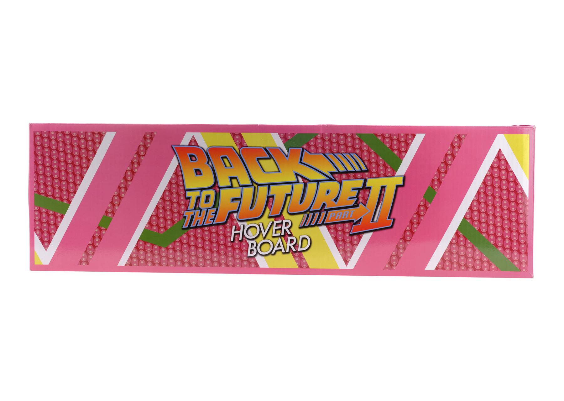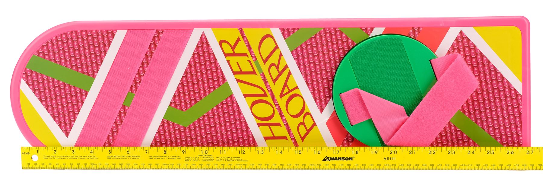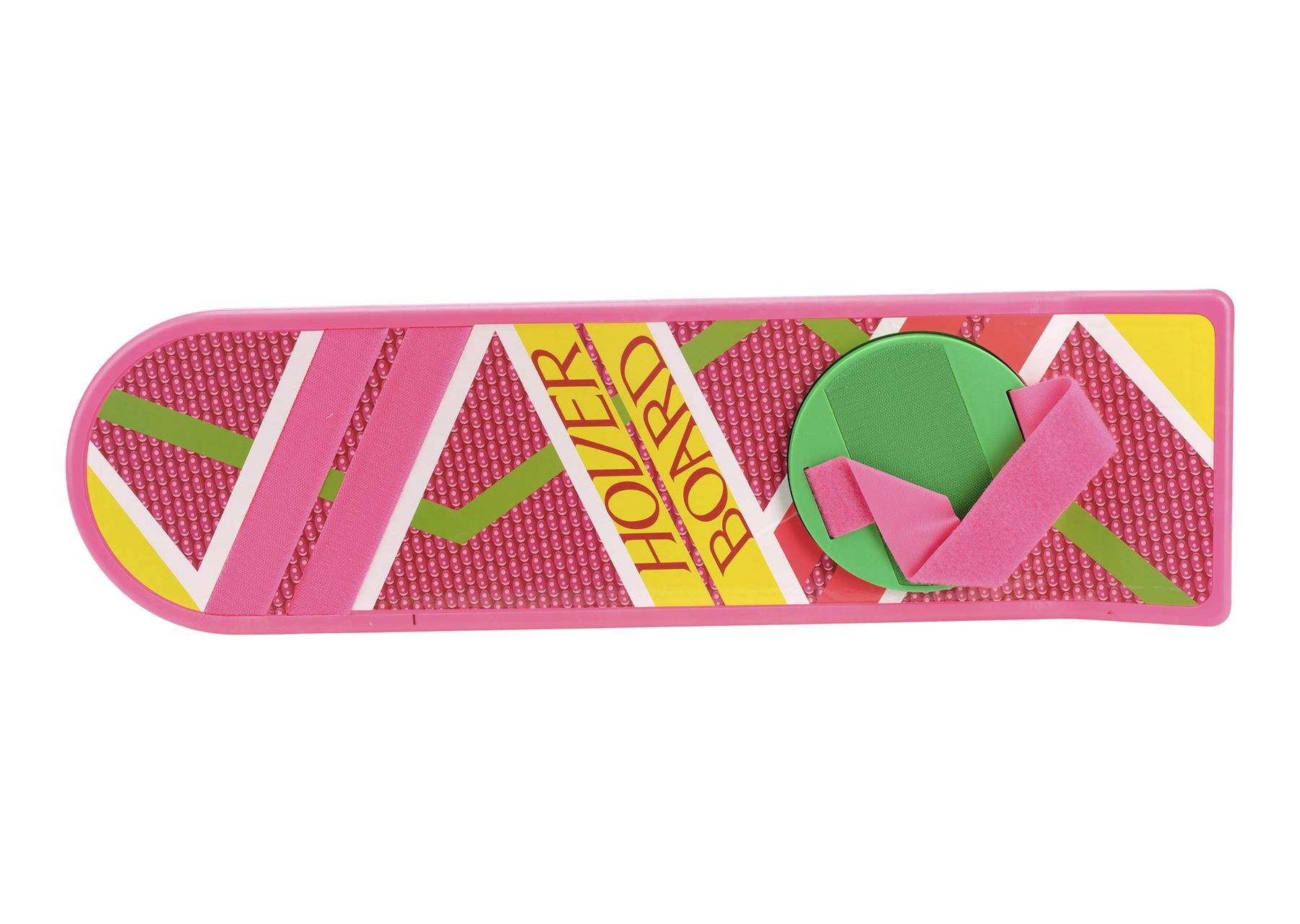This hoverboard is molded from plastic, painted pink throughout, and applied with decal details. It features a pink strap on a green foot pad, the film's title logo in the center of the bottom decal, and silver-color plastic hoverpads signed in blue ink by Fox and Lloyd and applied with Beckett Authentication stickers. Also included is the hoverboard's original pink cardboard box, which exhibits minor edge wear. The hoverboard exhibits some bubbling on the decals. Dimensions: 27.5" x 8" x 2.5" (70 cm x 20.5 cm x 6.5 cm)