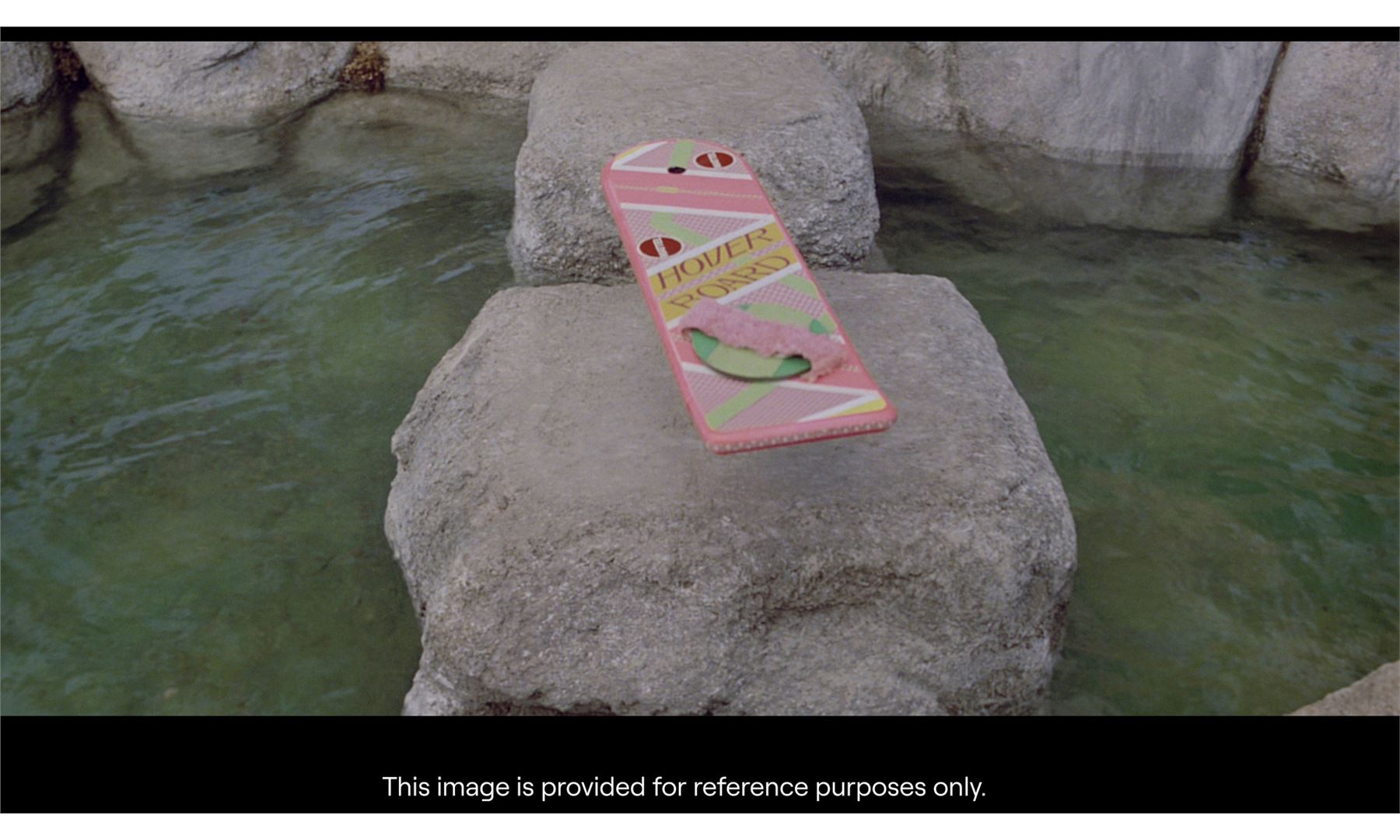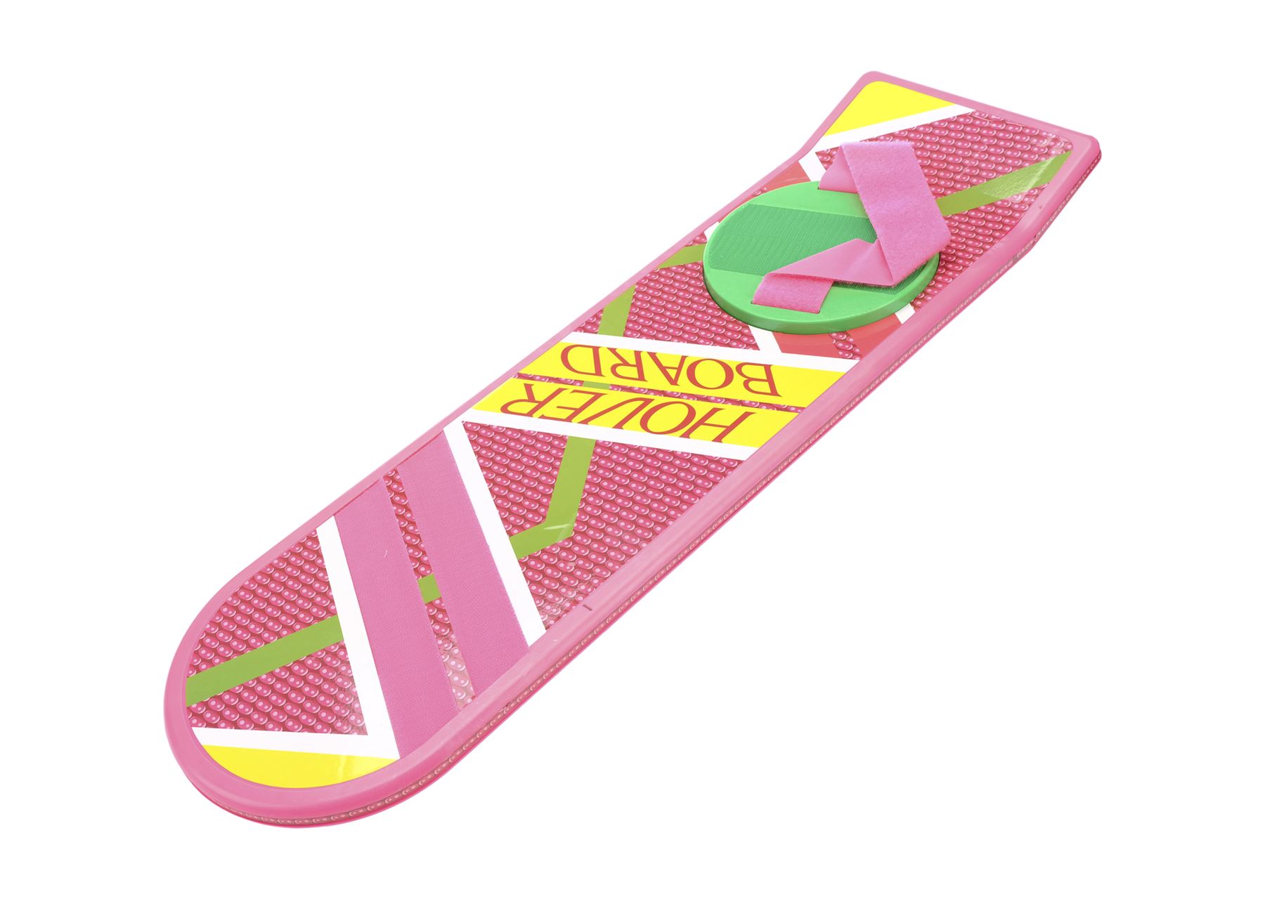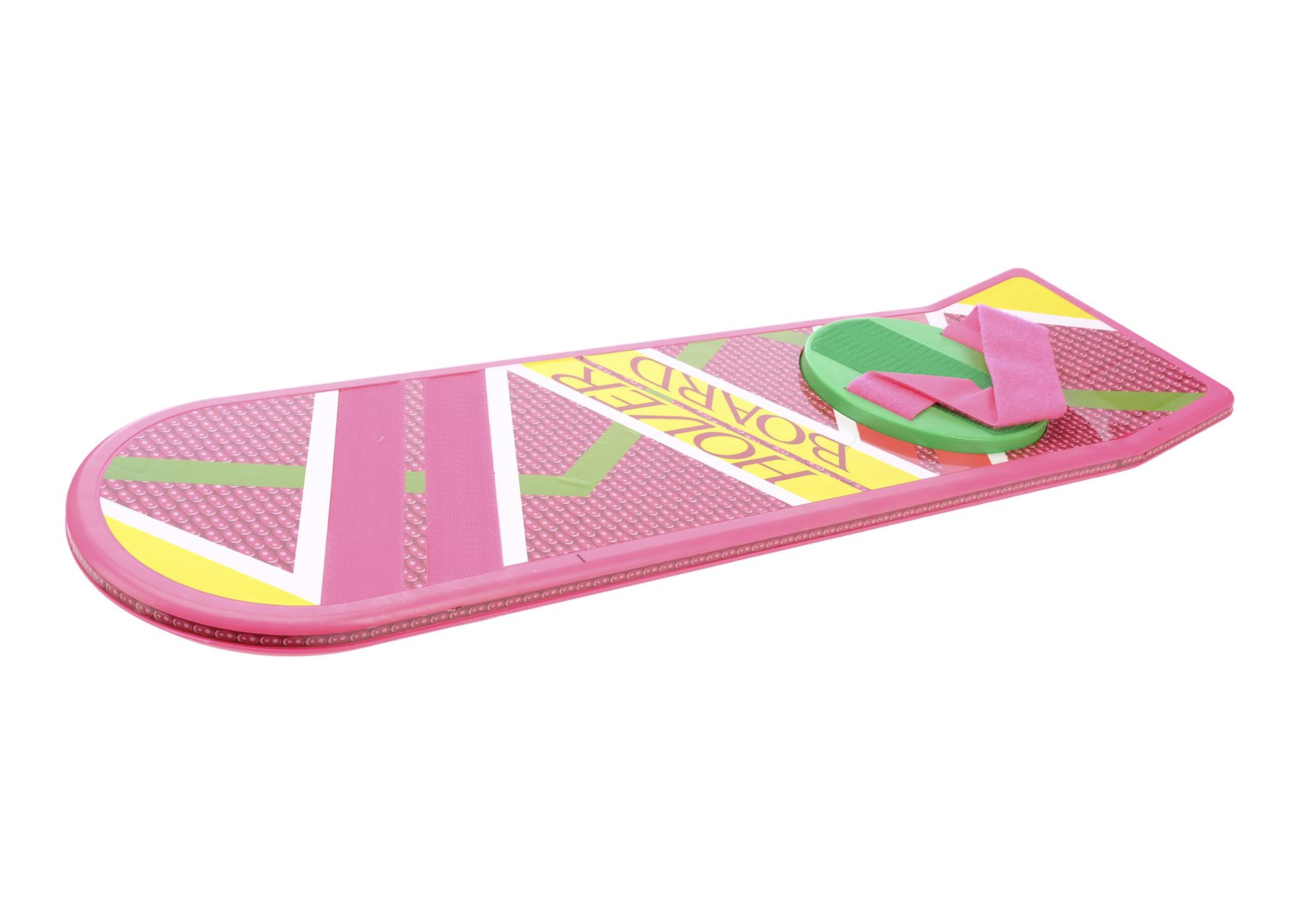 This hoverboard is molded from plastic, painted pink throughout, and applied with decal details. It features a pink strap on a green foot pad, the film's title logo in the center of the bottom decal, and silver-color plastic hoverpads signed in blue ink by Fox and Lloyd and applied with Beckett Authentication stickers. Also included is the hoverboard's original pink cardboard box, which exhibits minor edge wear. The hoverboard exhibits some bubbling on the decals. Dimensions: 27.5" x 8" x 2.5" (70 cm x 20.5 cm x 6.5 cm)