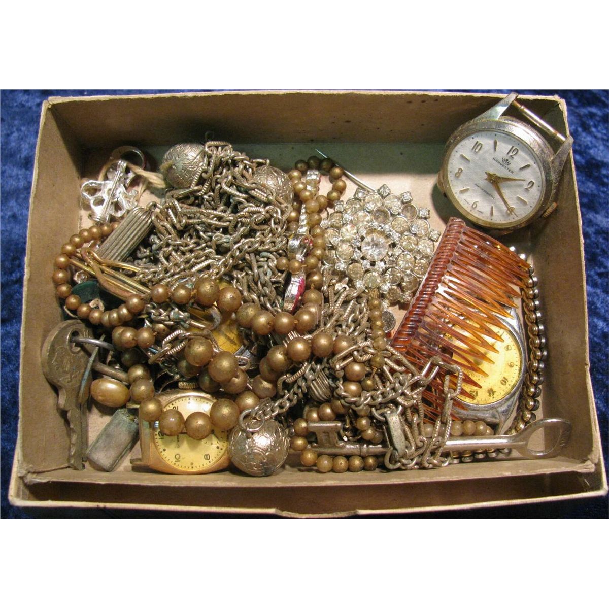 547. Box of Antique Keys, Watch Heads, Chains, & Buttons.