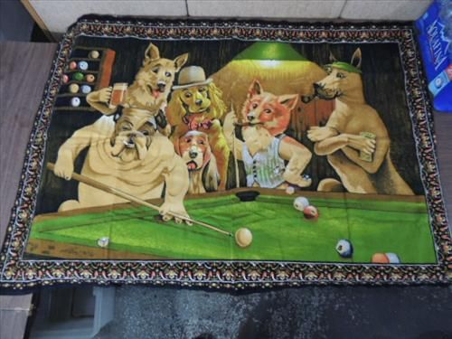 54X38 VINTAGE DOGS PLAYING POOL PICTURE ON COTTON FABRIC. AS SHOWN. VIE WPICTURE FOR DETAIL.