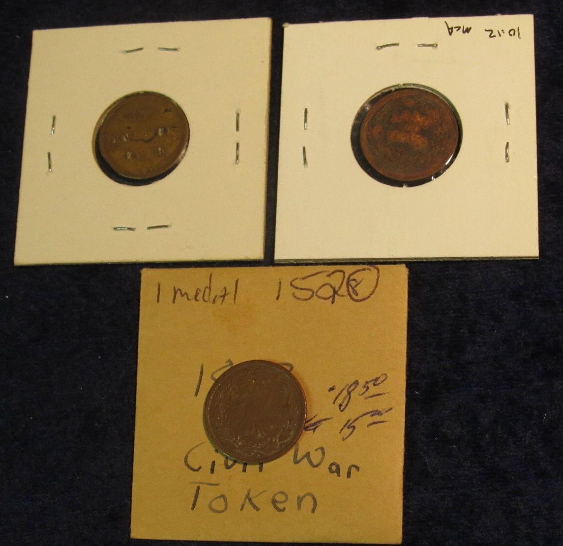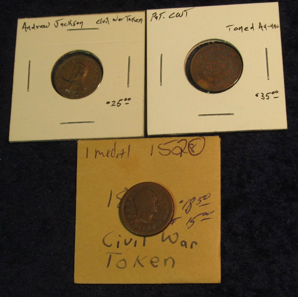 55. (3) Different Civil War Tokens: Andrew Jackson; "The Federal Union it Must and Shall be preserved"; & 1863 George Washington "1 Medal". Priced to sell at $75.00.