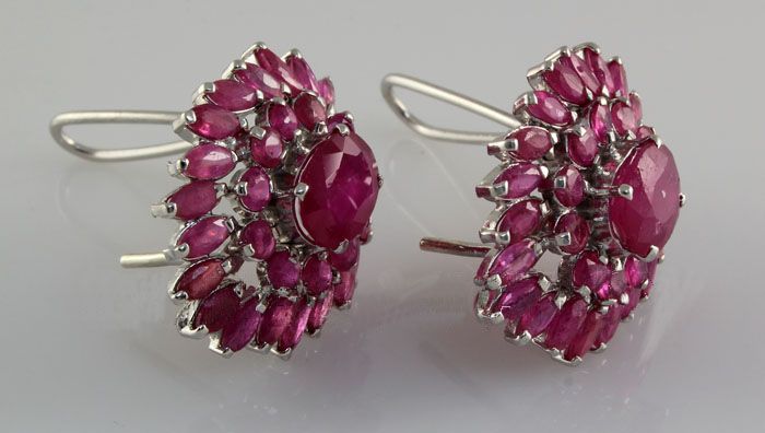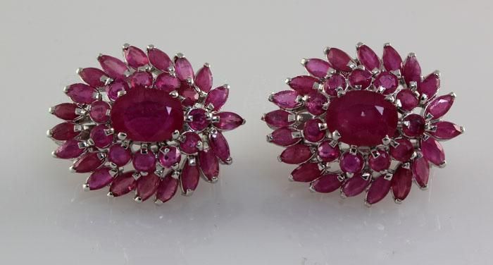 55.45CTW Pretty Pink Ruby Stone in Silver Earring **|**|** Unique Flower Design Pink Ruby Silver Earring w/ Clipon Back; Size: oval 9x7mm*round 3mm*mq 4x2mm; ctw: 12.90; stone count: 64; gram weight: 8.51 ; MSRP: $2400
