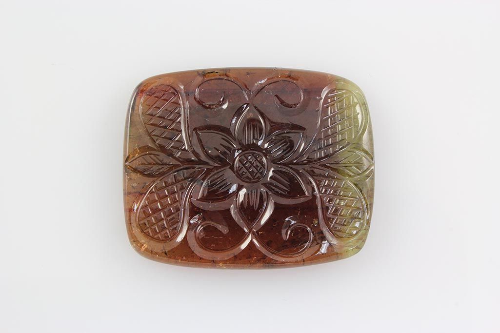 55.81ctw Multi-ColorTourmaline w/ FlowerCarvedDesign **|**|** 34.77x28.05x4.90mm Hand Carving Flower Design in Natural Multi-Color Tourmaline Rectangular Shape ; MSRP: $200