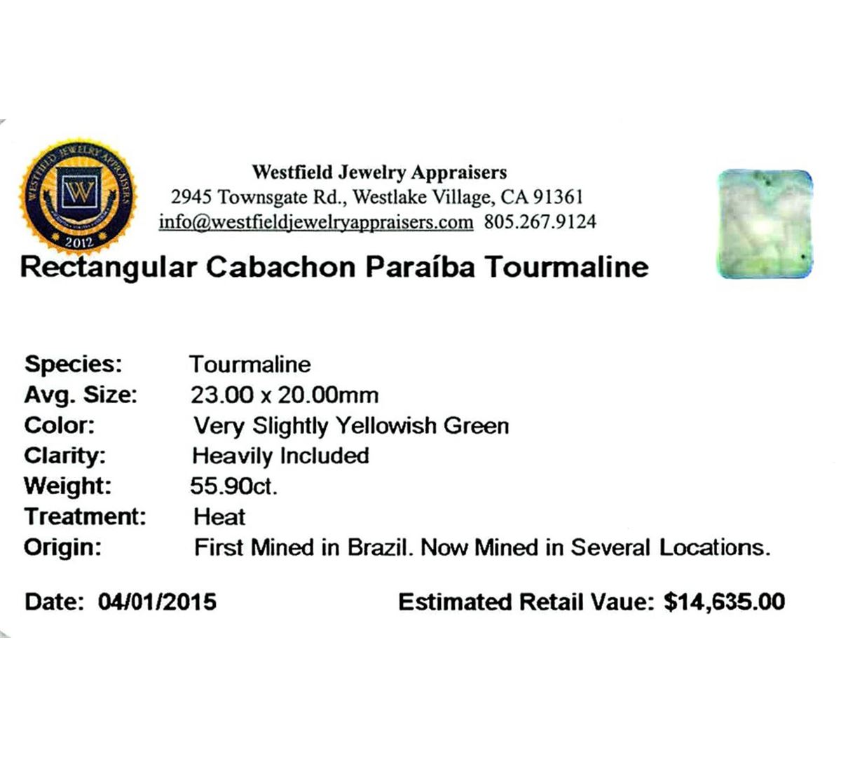 One rectangular cabochon cut natural Paraiba tourmaline exact weight 55.90ct., clarity is heavily included, cut is good. Westfield Appraised at $14,635.00.