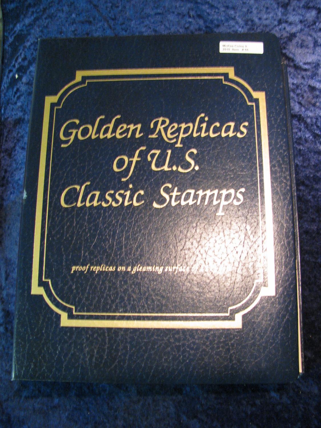 55. Large Simulated Leather Bound Album titled "Golden Replicas of U.S. Classic Stamps" Proof replicas on a gleaming surface of 22K gold. Features 53 different covers which, originally sold for $6.25 each. Total value $331.25. Includes the super rare 1930 Graf Zeppelin issue.