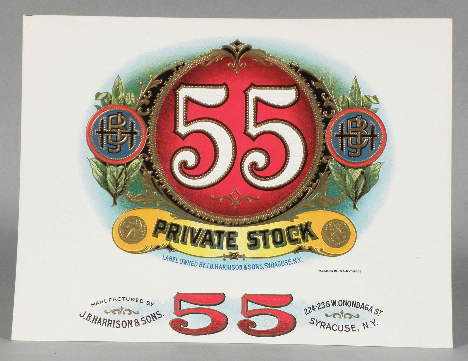 55 Private Stock Cigar Box Label. Syracuse, NY. Embossed and gold leaf. Mint condition. 8 3/8 X 6 1/4 inches. Starting bid $100
