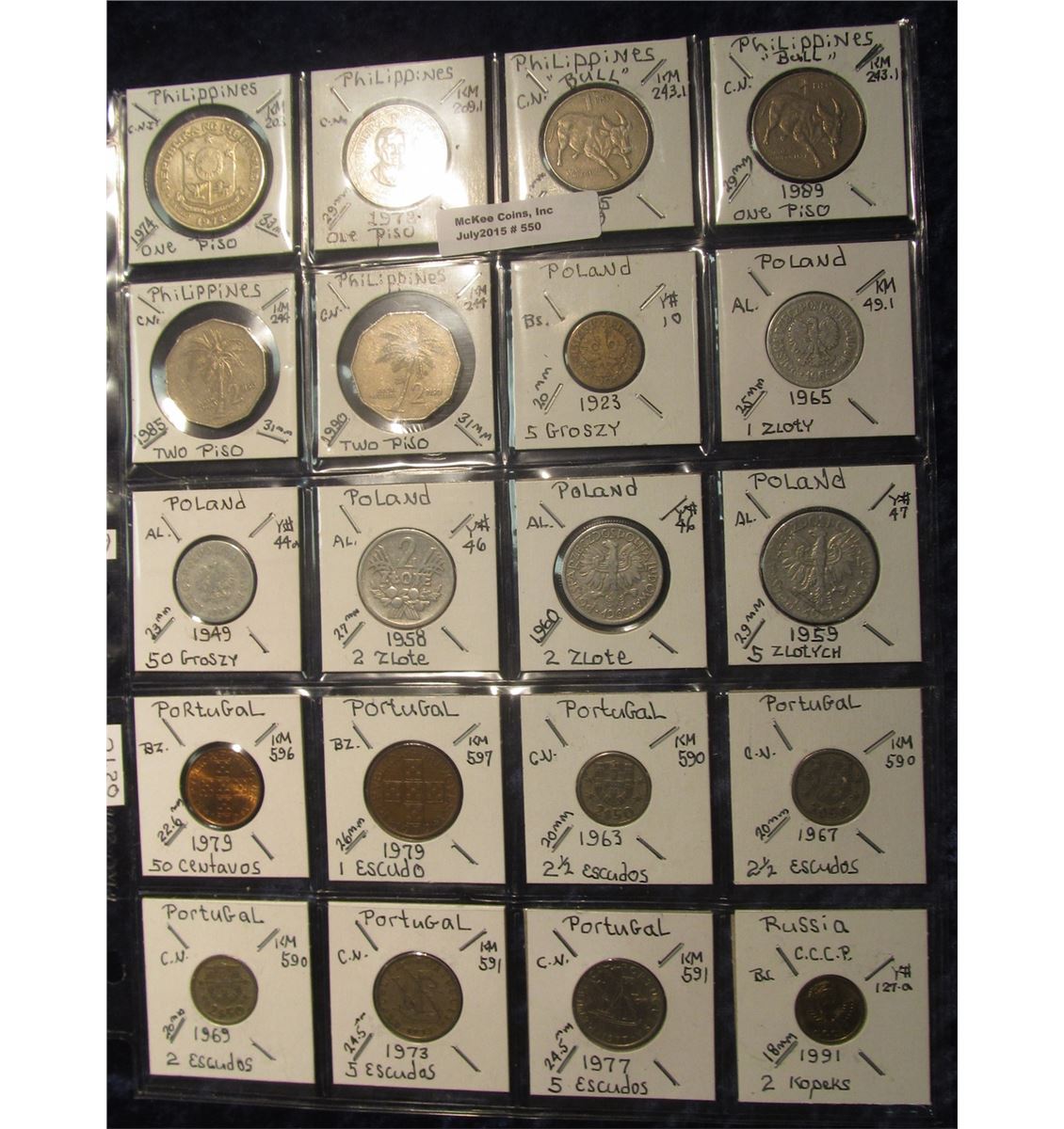 550. (20) World Coins in Plastic page, all identified and in 2" x 2" holders. Includes: Philippines, Poland, Portugal, & Russia. KM Catalog Value $21.21