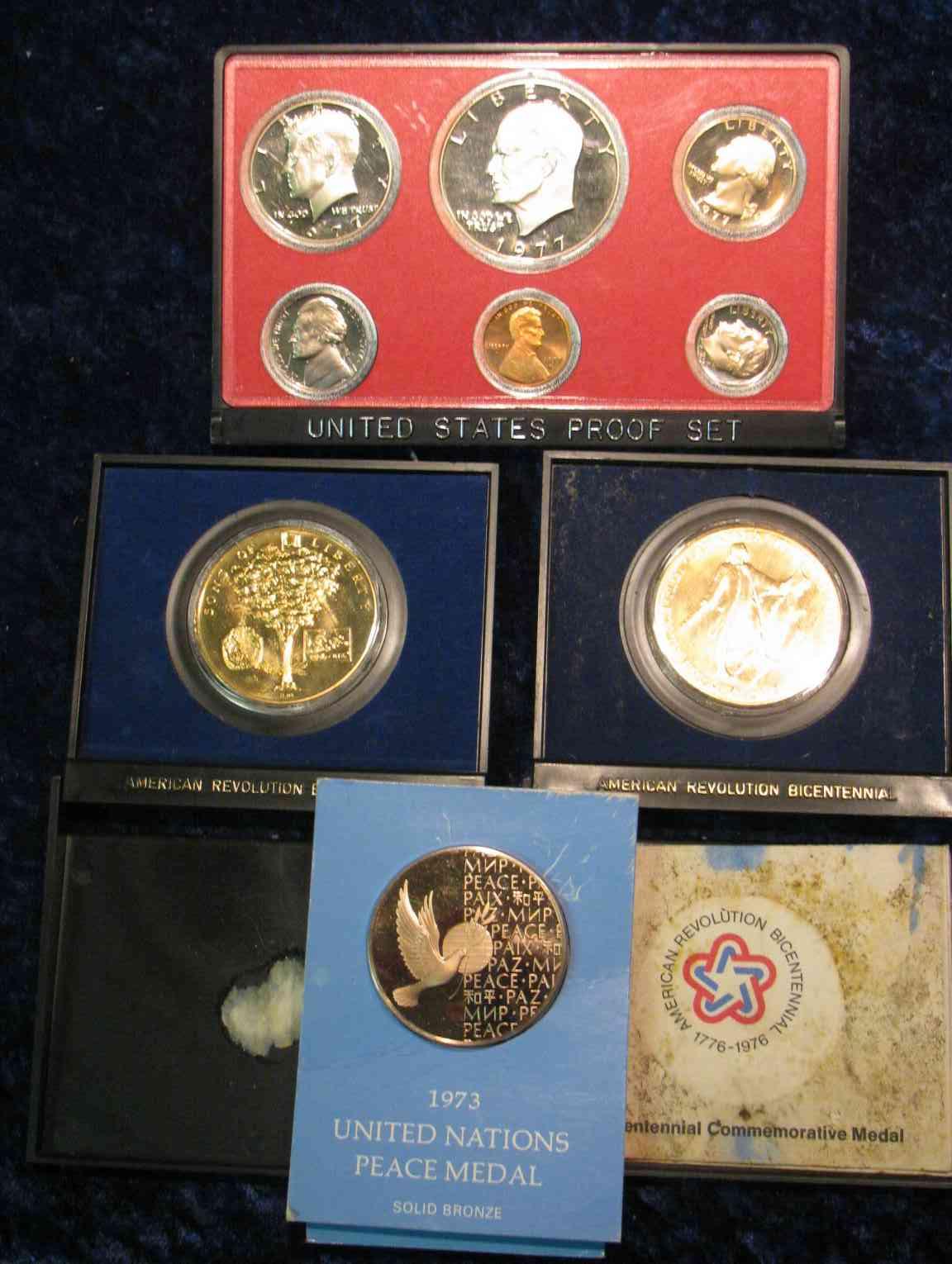 551. 1972 & 74 American Revolution Bicentennial Medals in cases; 1977S Proof Set; & 1973 Solid Bronze United Nations Peace Medal in holder.