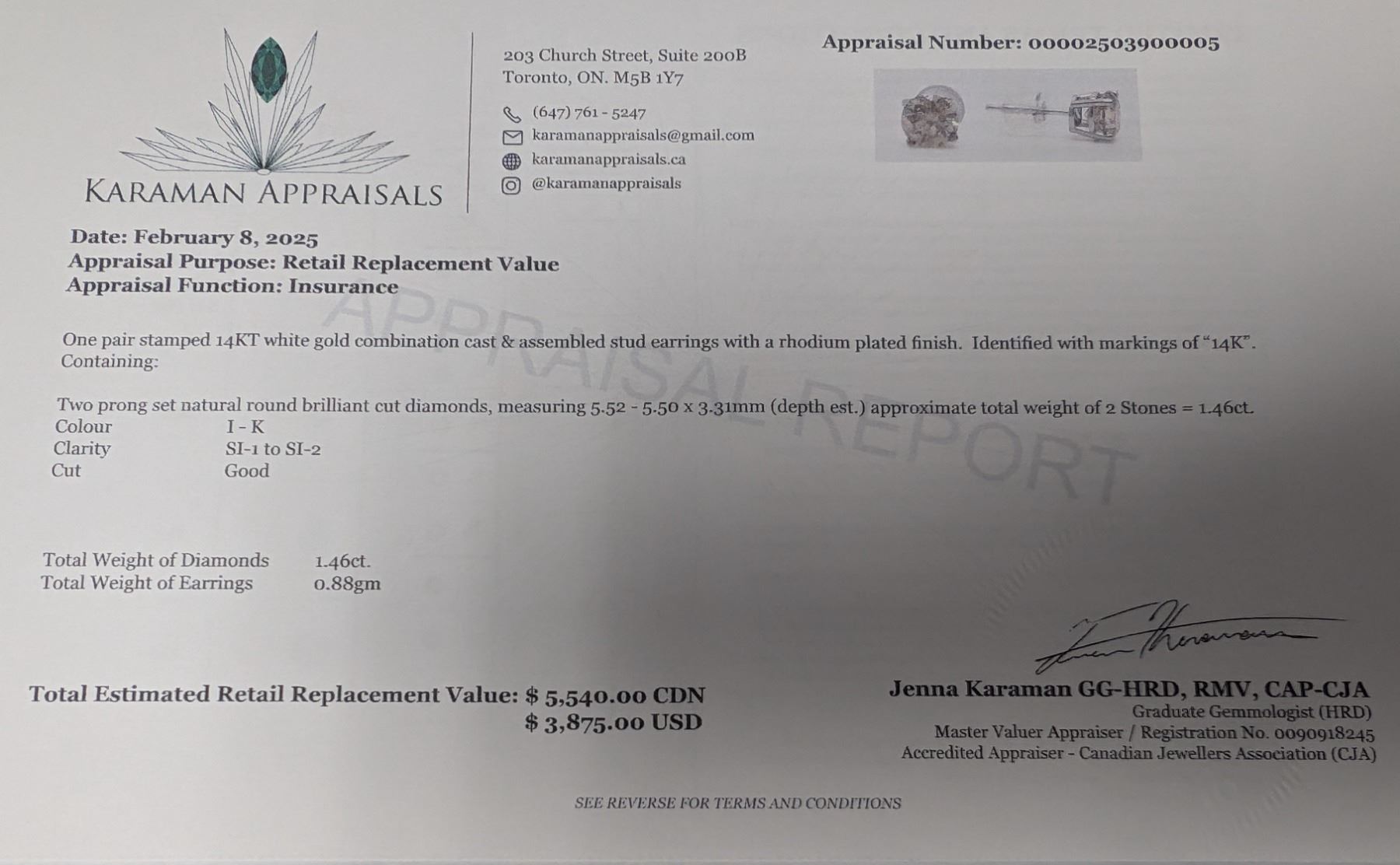 $5540, 14K(0.88g), NATURAL DIAMOND (1.46ct)EARRING, appraised/retail value $5540