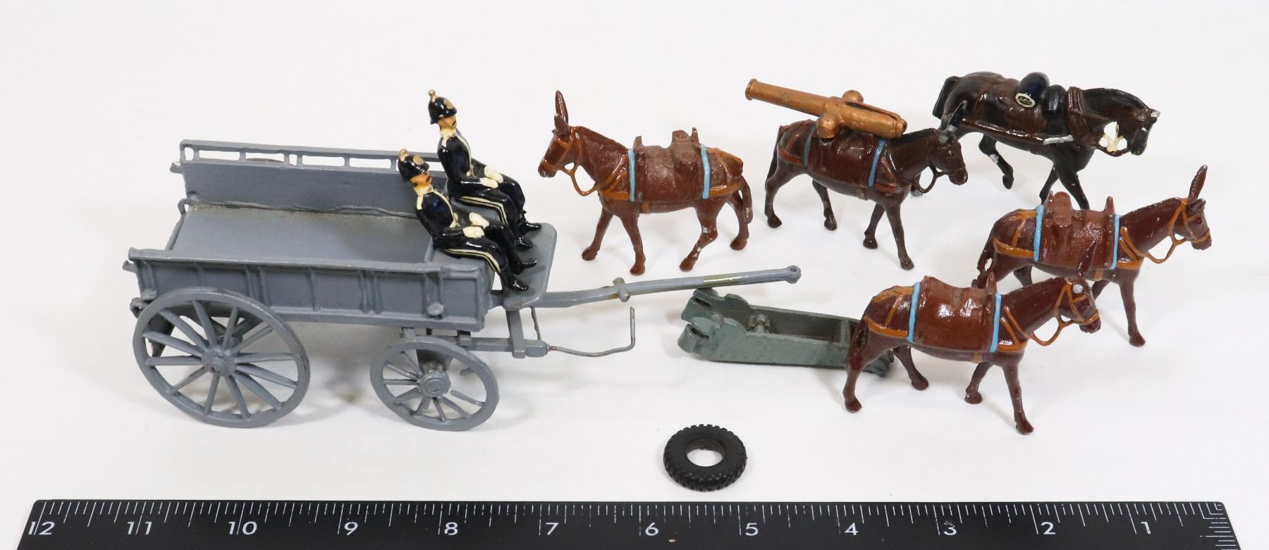 WORN CONDITION REQUIRES REPAIR TO WHEEL VINTAGE PAINTED SET INCLUDES CANNONS ON HORSEBACK -FROM BUYOUT OF 1980'S BRITISH TOY STORE, INCLUDING MODEL KITS, DIECAST METAL CARS & VEHICLES, TRAINS, VINTAGE AND INTERNATIONAL COLLECTABLES INCLUDING LATER 1990'S TOYS AND EARLY 1960'S TOYS AND MORE