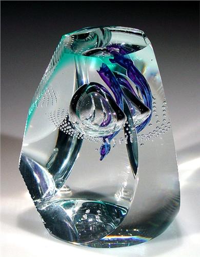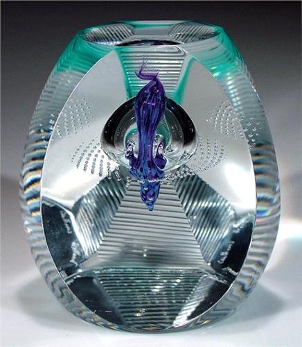 Caithness Glass 1999 "Millennium Jewel" high-domed paperweight, with an abstract design composed of a large bubble attached to a ribbon of purple, over clear ground. Flat top, with three, flat, side panels and a horizontal-cut background. Signed. Limited edition #7 of 100. Height 3 1/4". NO RESERVE