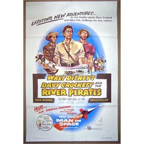 This is a one sheet poster from the 1956 Walt Disney film, DAVY CROCKETT AND THE RIVER PIRATES, starring Fess Parker, Buddy Ebsen, and Jeff York. Measures 41" x 27". No pinholes, no tears, no staple holes.