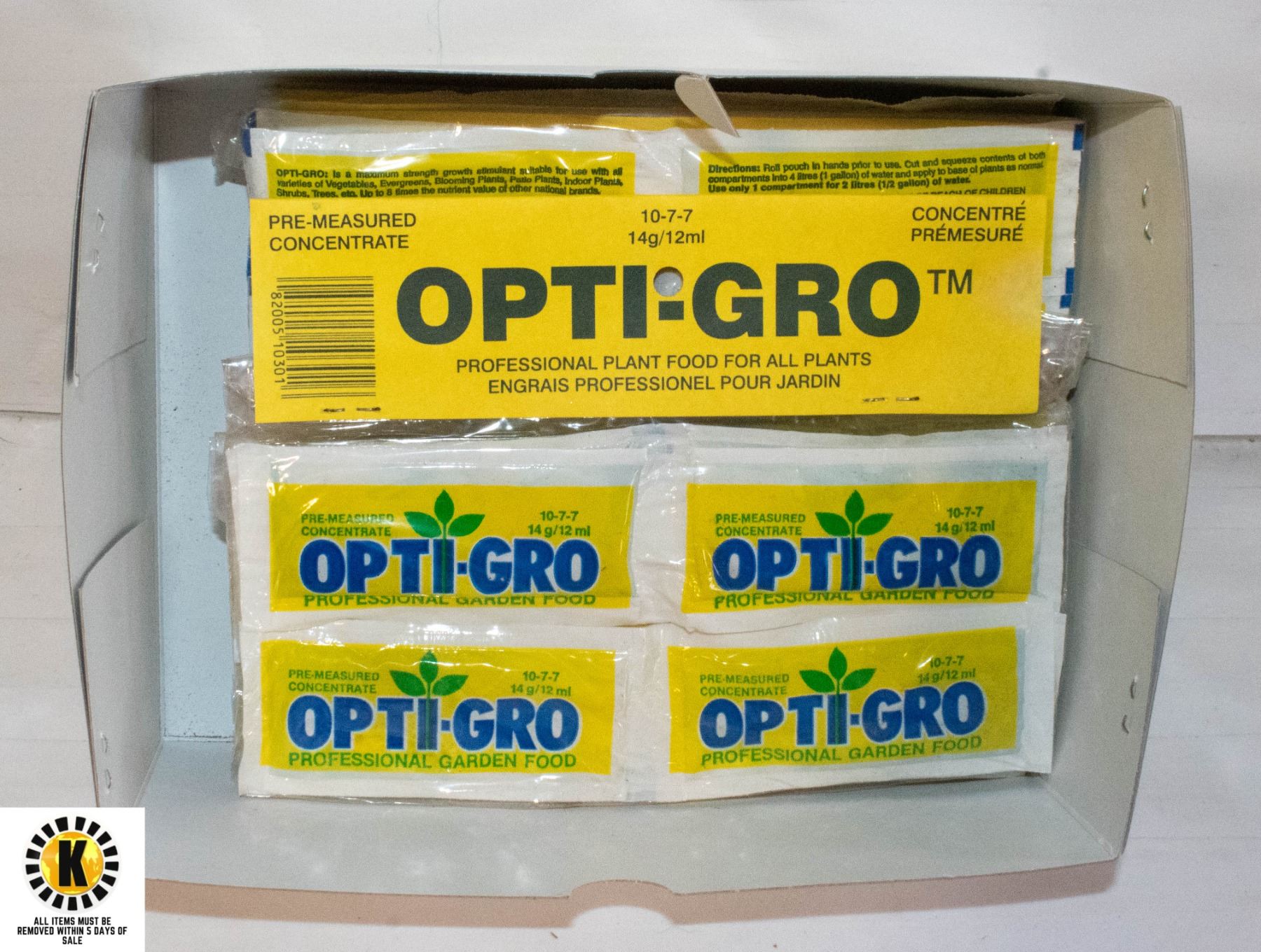 OPTI-GRO PROFESSIONAL GARDEN AND PLANT FOOD FOR ALL PLANTS 10-7-7. 7 BAGS WITH 8 INDIVIDUAL PACKETS 14GRAM IN EACH BAG.