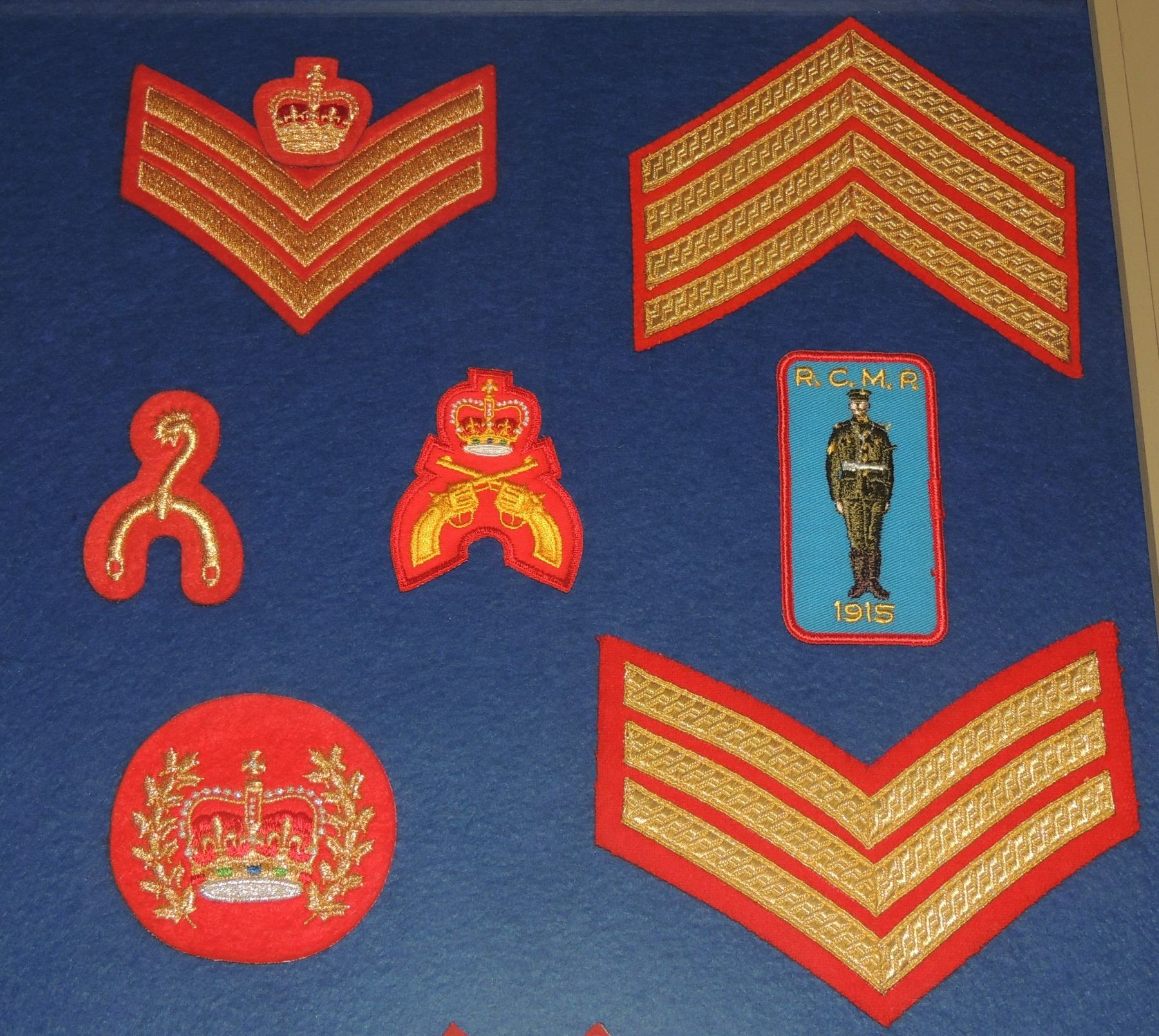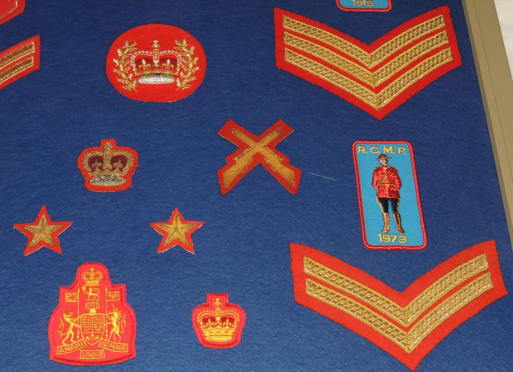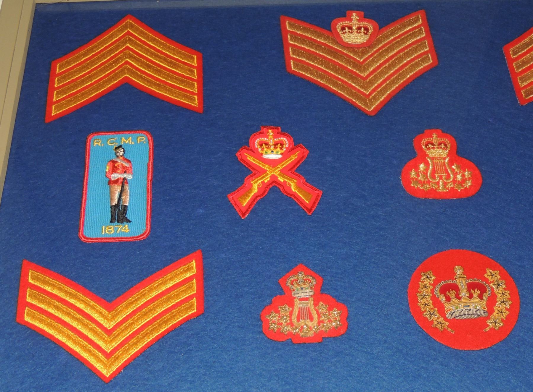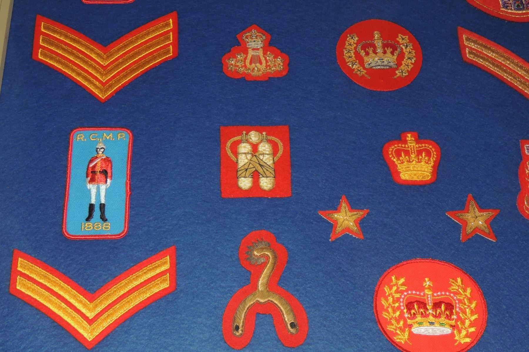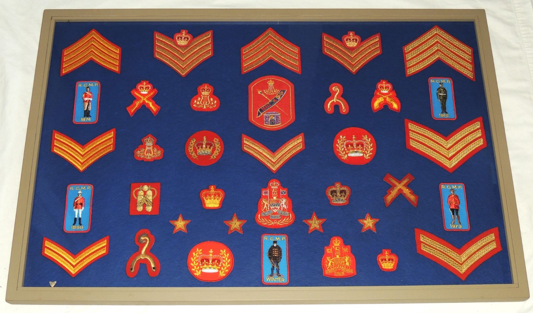 RCMP LOT OF 36 FRAMED INSIGNIA CLOTH PATCHES INC. ENBROIDERED DESIGNS SPURS CANADIAN LAW ENFORCEMENT POLICE IN FRAME