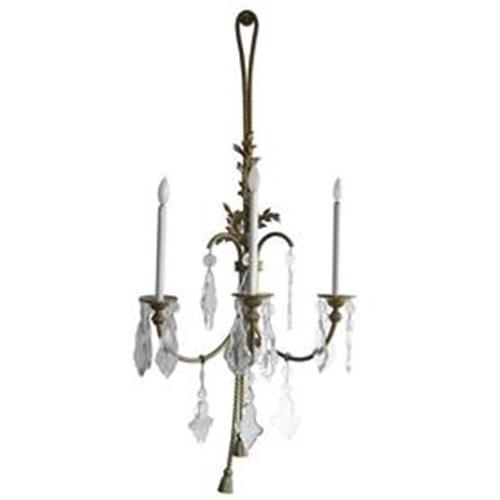 This extraordinary, antique bronze sconce measures an impressive 56" tall, 24" wide and 16" deep. It features a draped tassle motif, three candle lights and eighteen cut crystal pendants. Electrified and in fine working order.