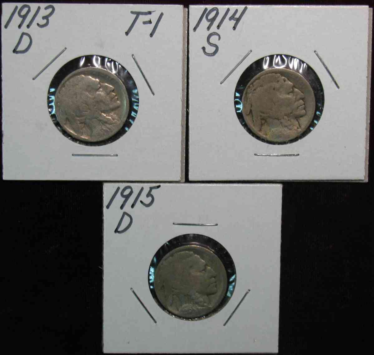 563. 1913D T.1, 14S, & 15D Buffalo Nickels. Restored dates.