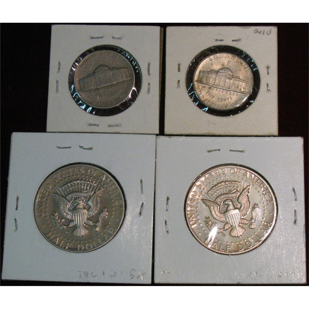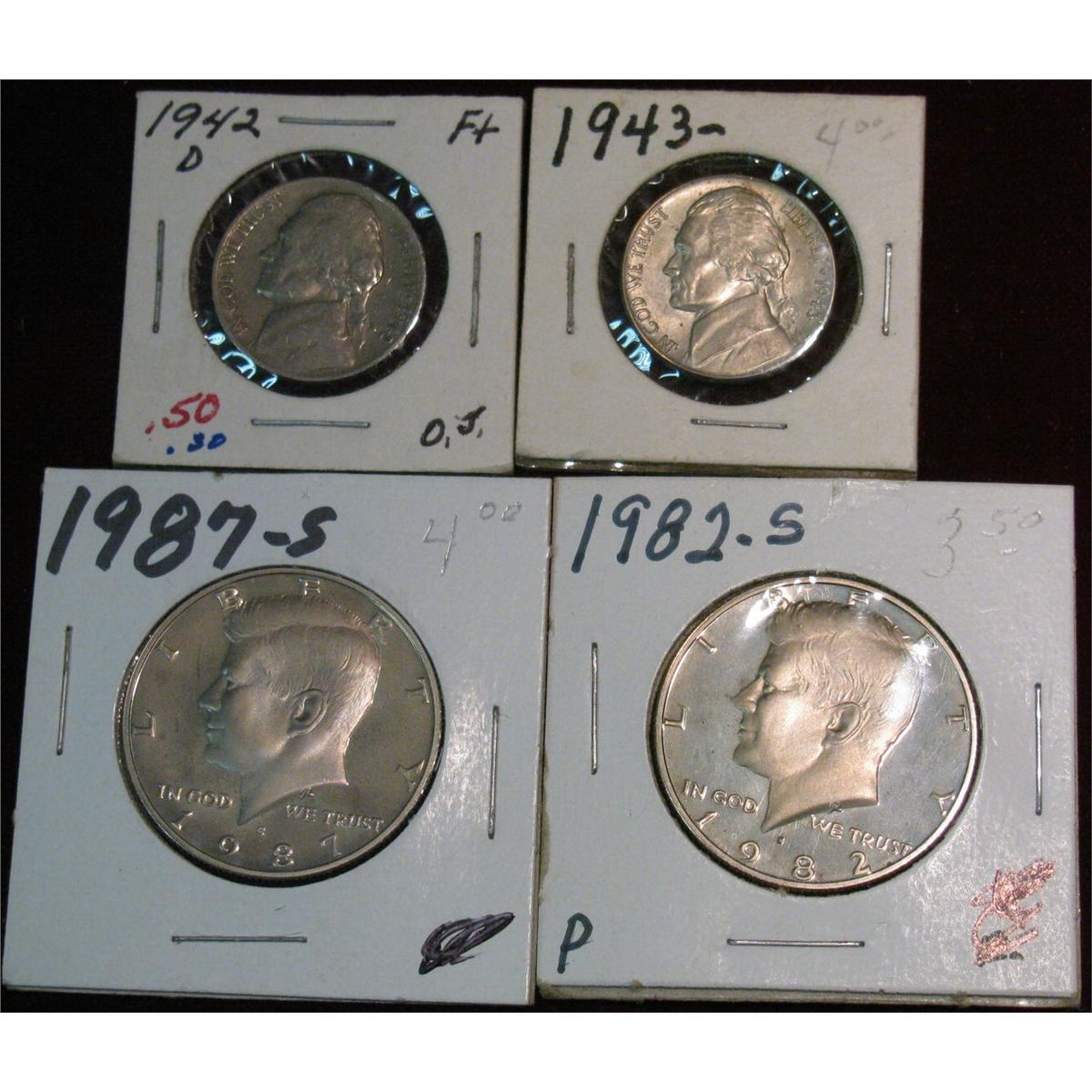 563. 1942D F-12 & 43P EF Nickels; 1982S & 87S Proof Half Dollars.
