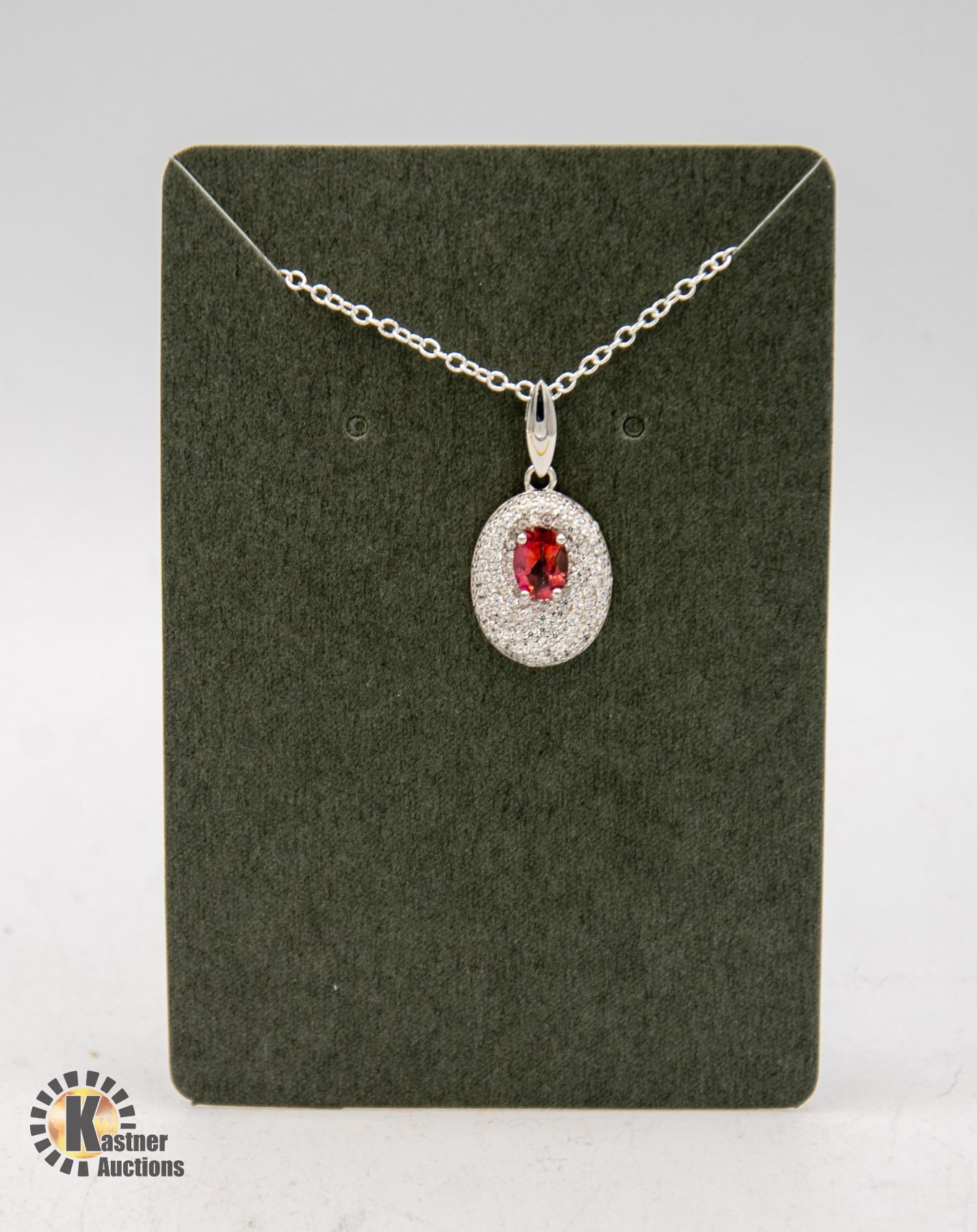 PENDANT WITH PAVE SET CUBIC ZIRCONIA WITH RED TONE OVAL STONE