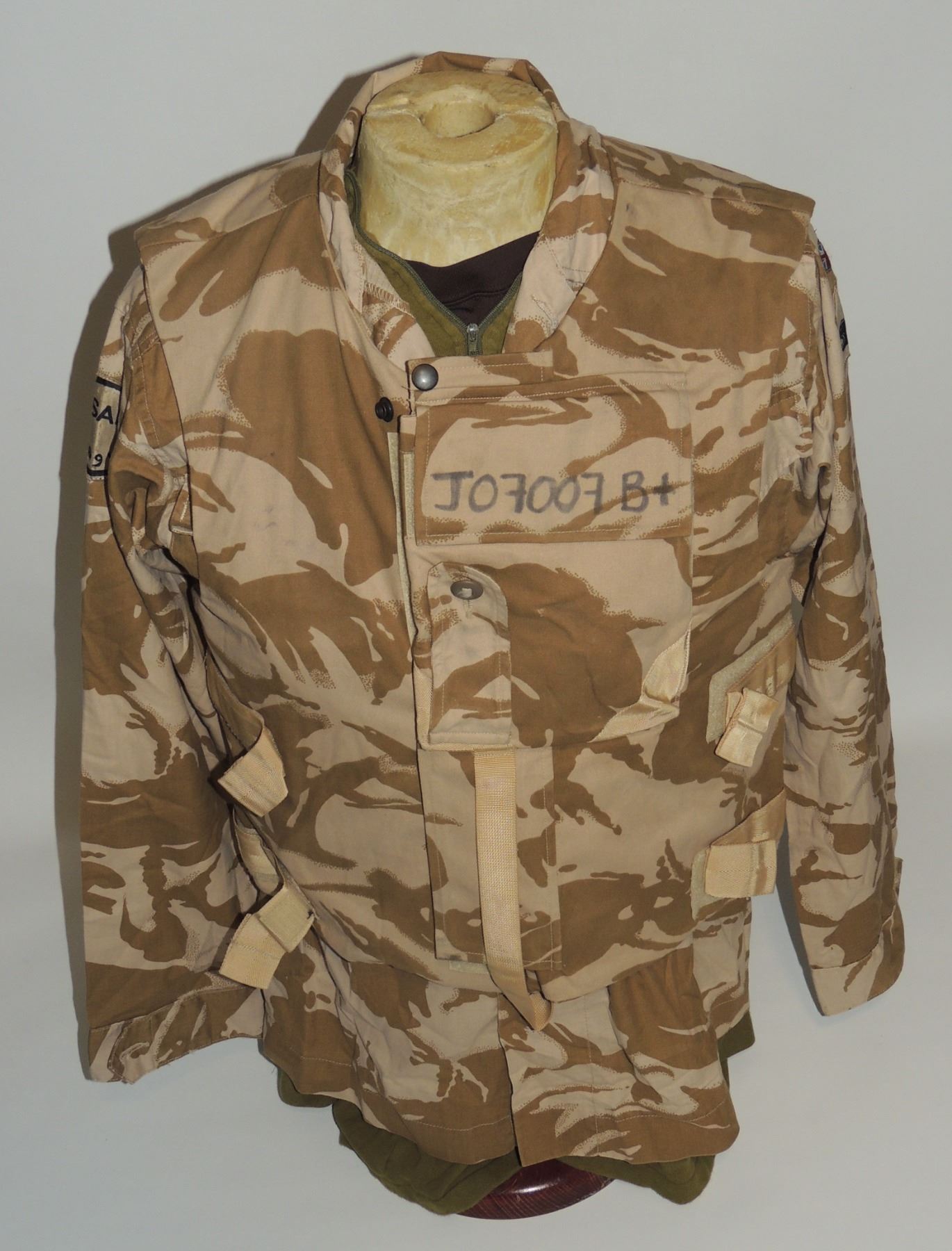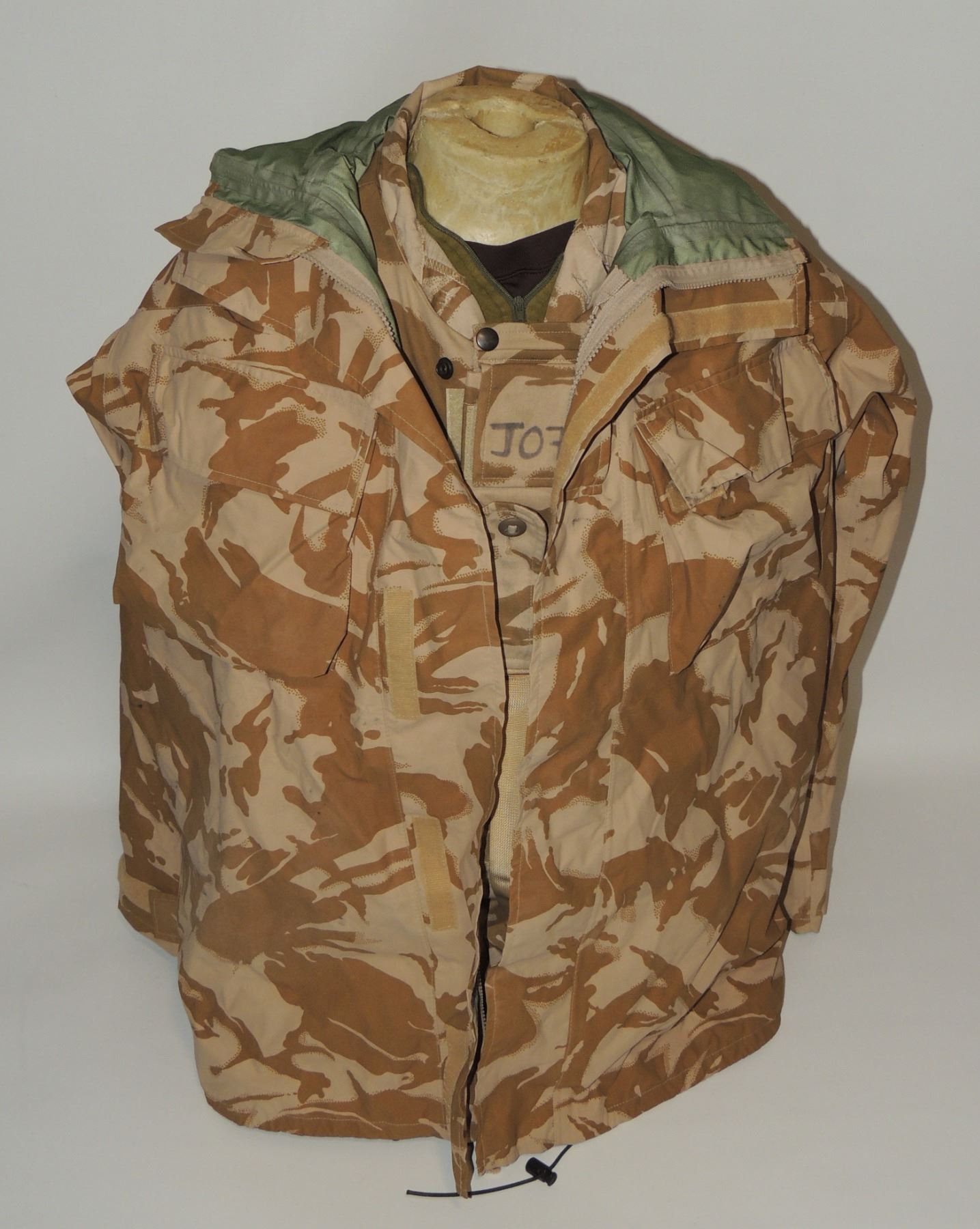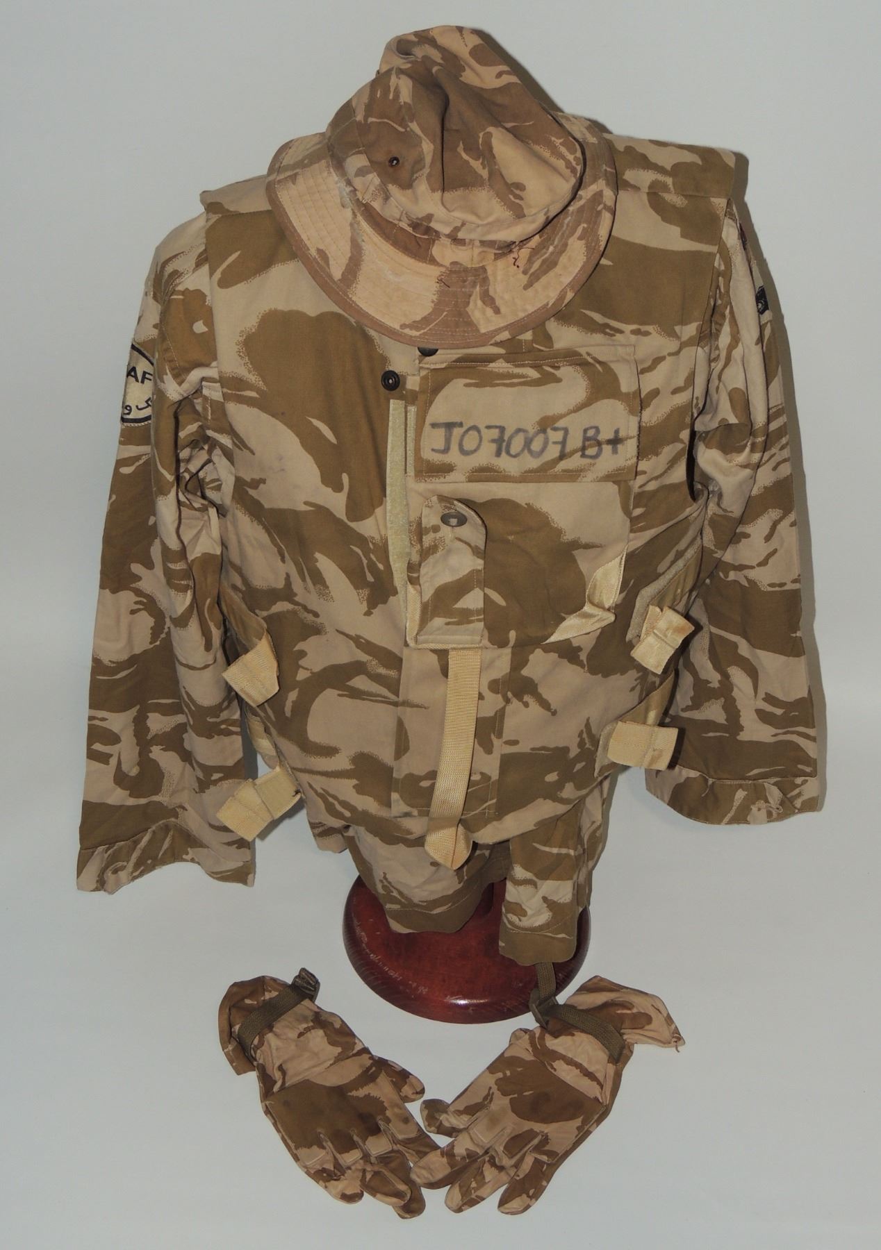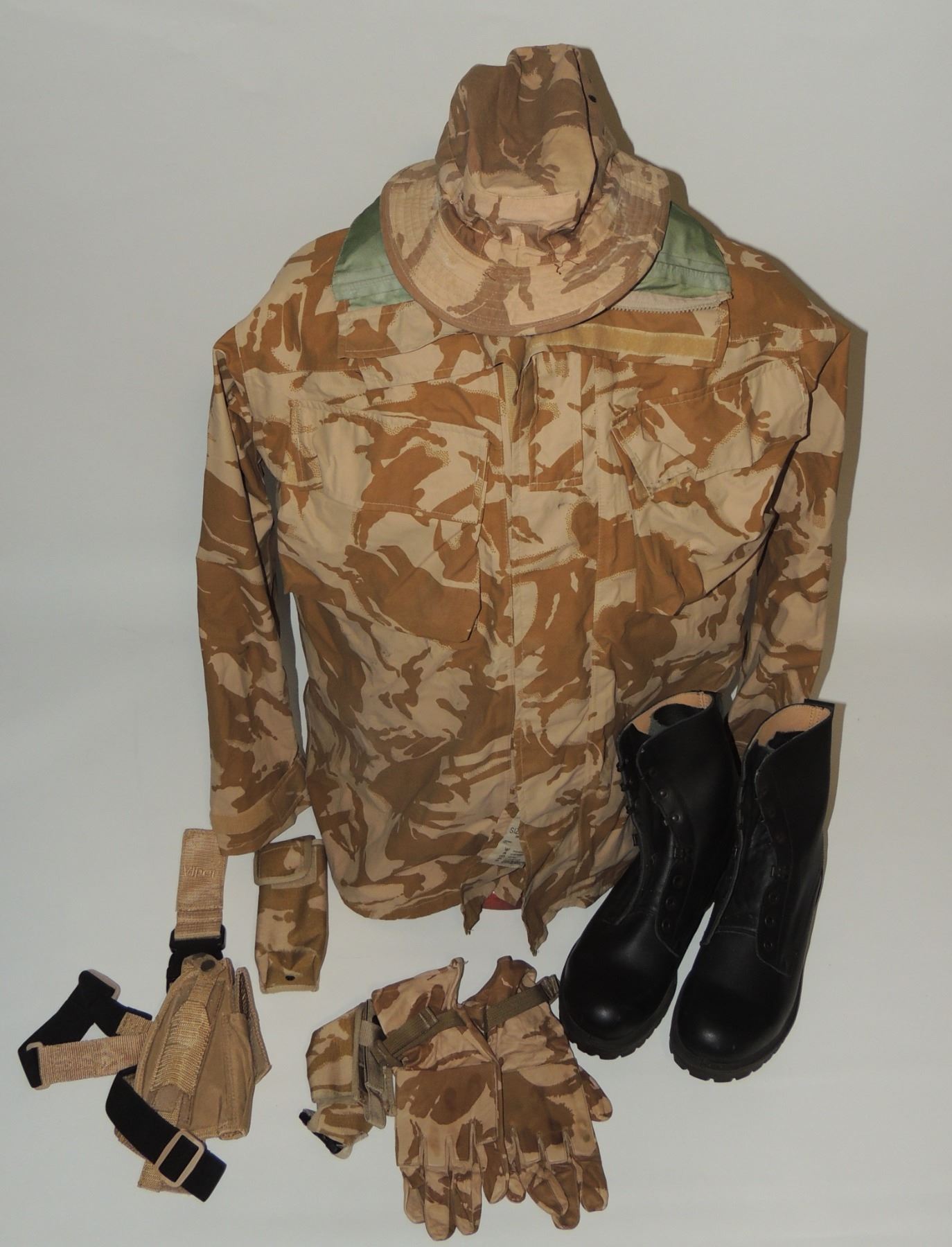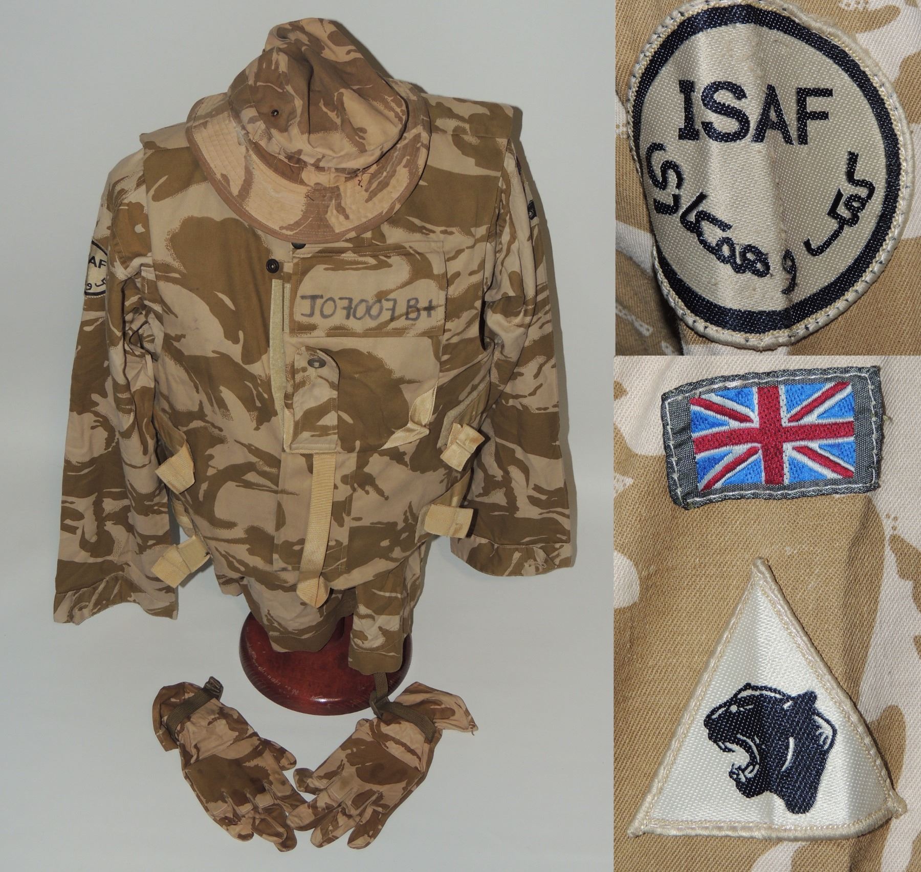 NAMED "JONES" AND NUMBERED "JO7007B+" INCLUDES BODY ARMOUR COVER DESERT DPM, COMBAT TROPICAL JACKET WITH DESERT DPM CAMOFLAUGE WITH 19TH LIGHT BRIGADE PATCH ISAF PATCH AND UNION JACK PATCH,MVP COMBAT JACKET DESERT DP CAMO SIZE 180/104 TILLY HAT DESERT CAMO, 2006 DATED COMBAT WARM WEATHER DESERT CAMO GLOVES, TWO BROWN COMBAT T-SHIRT, BRITISH GREEN ARMY JUMPER SWEATER AND COLD WEATHER SHIRT, VIPER BELT STORAGE ATTACHMENT AND TWO ADDITIONAL CAMO BELT STORAGE POUCHES "POUCH KNIFE/TORCH" AND "40MM GRENADE", COVER POUCH SIDE RUCKSACK SMALL 2007 DESERT CAMO COVER, AND BRITISH LEATHER MILITARY COMBAT BOOTS WITH INTERIOR MARKINGS. EXCELLENT FOR DISPLAY ON AFGHANISTAN WAR, WAR ON TERROR EARLY 2000'S BRITISH MILITARY ALLIED FORCES UNIFORM GROUPING.