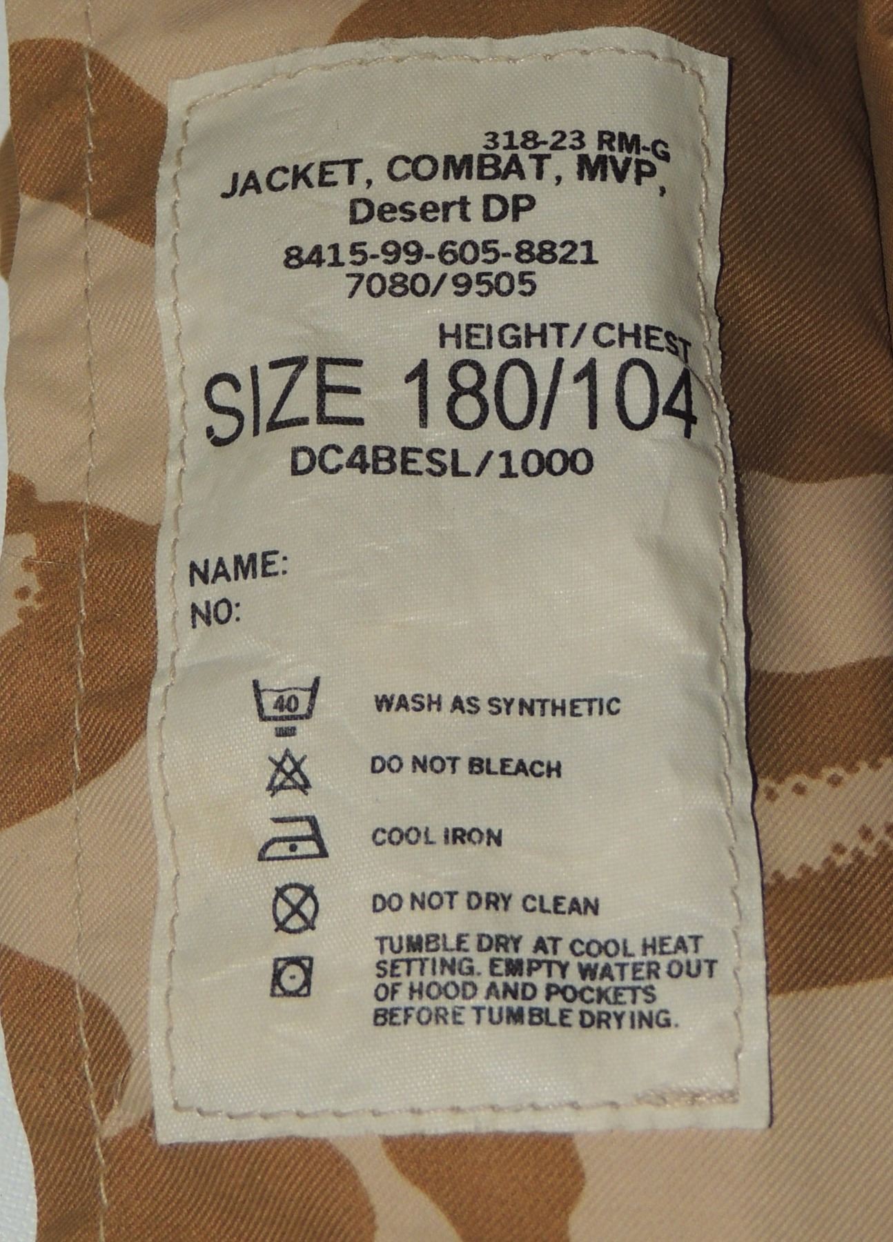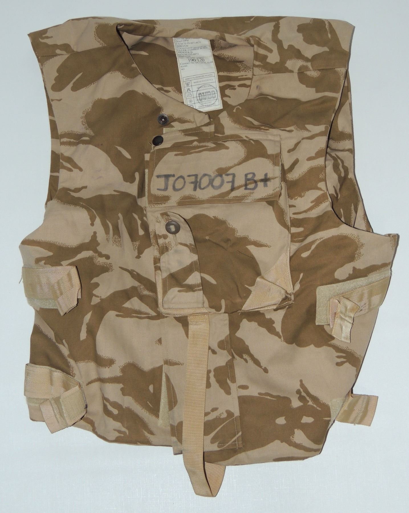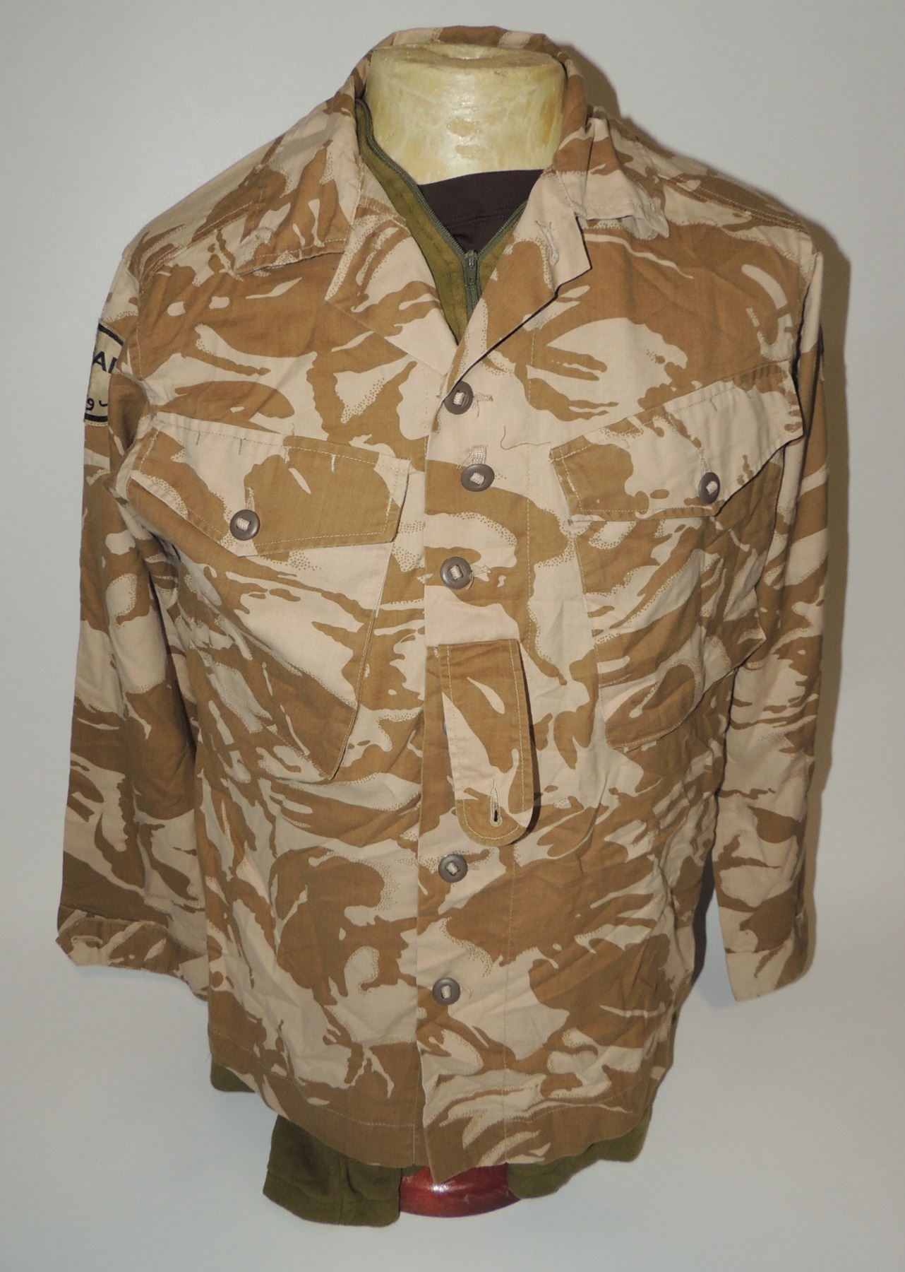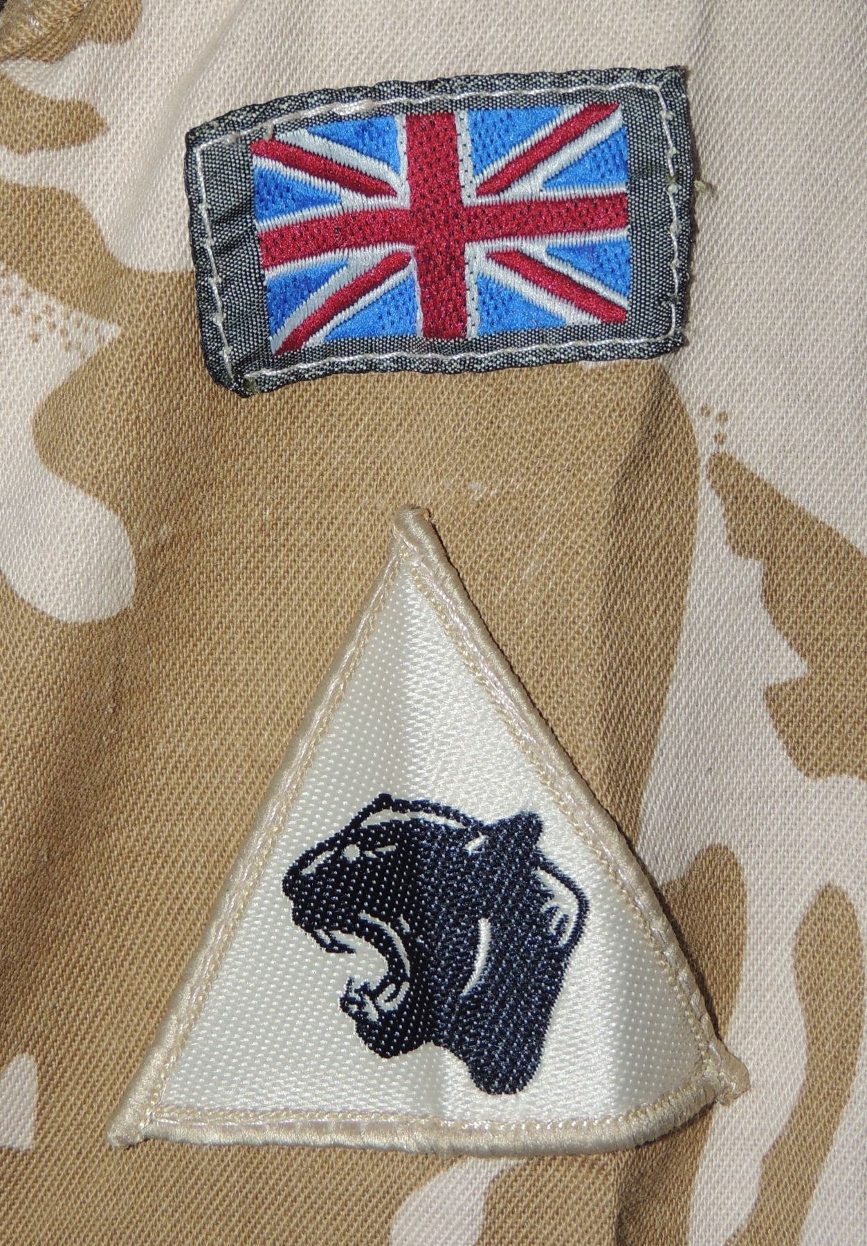 NAMED "JONES" AND NUMBERED "JO7007B+" INCLUDES BODY ARMOUR COVER DESERT DPM, COMBAT TROPICAL JACKET WITH DESERT DPM CAMOFLAUGE WITH 19TH LIGHT BRIGADE PATCH ISAF PATCH AND UNION JACK PATCH,MVP COMBAT JACKET DESERT DP CAMO SIZE 180/104 TILLY HAT DESERT CAMO, 2006 DATED COMBAT WARM WEATHER DESERT CAMO GLOVES, TWO BROWN COMBAT T-SHIRT, BRITISH GREEN ARMY JUMPER SWEATER AND COLD WEATHER SHIRT, VIPER BELT STORAGE ATTACHMENT AND TWO ADDITIONAL CAMO BELT STORAGE POUCHES "POUCH KNIFE/TORCH" AND "40MM GRENADE", COVER POUCH SIDE RUCKSACK SMALL 2007 DESERT CAMO COVER, AND BRITISH LEATHER MILITARY COMBAT BOOTS WITH INTERIOR MARKINGS. EXCELLENT FOR DISPLAY ON AFGHANISTAN WAR, WAR ON TERROR EARLY 2000'S BRITISH MILITARY ALLIED FORCES UNIFORM GROUPING.