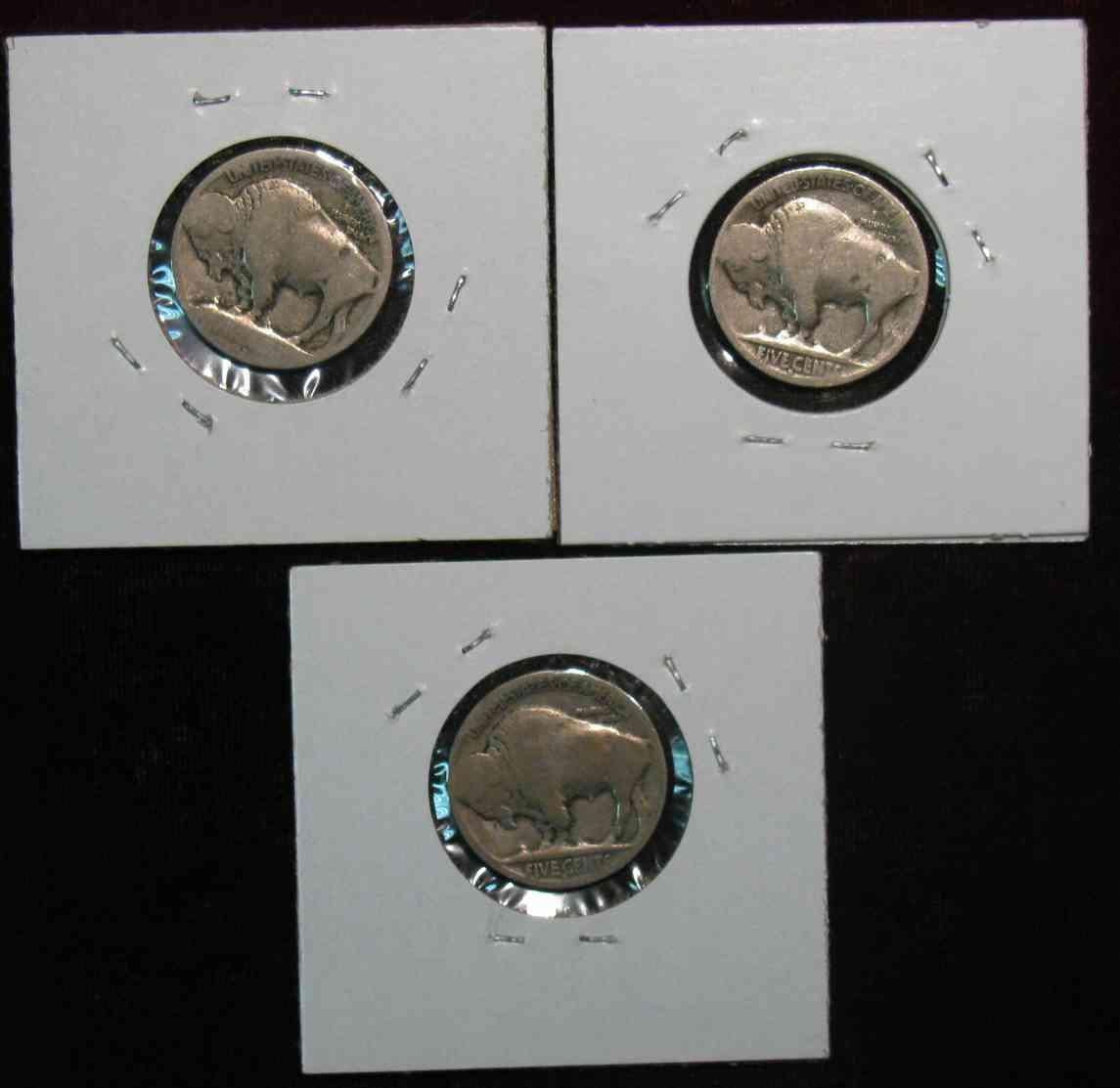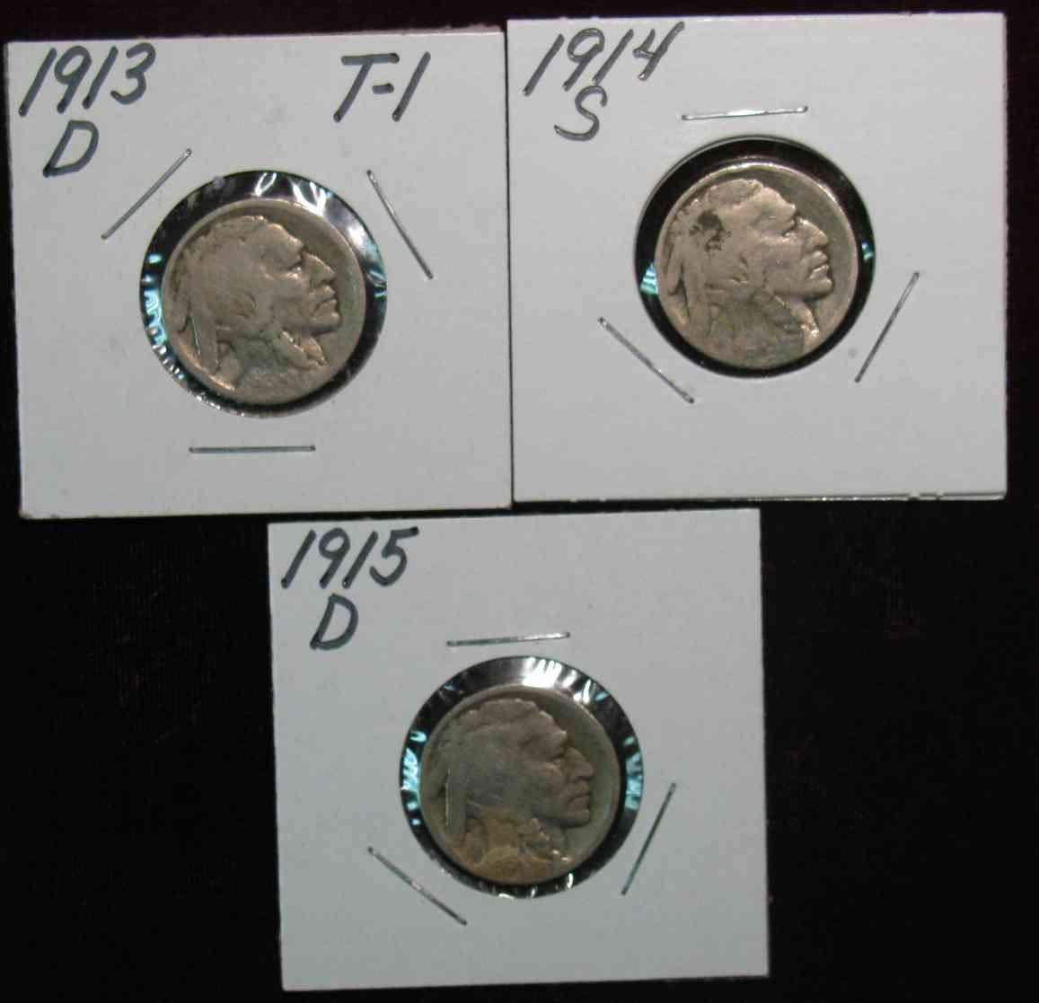 566. 1913D T.1, 14S, & 15D Buffalo Nickels. Restored dates.