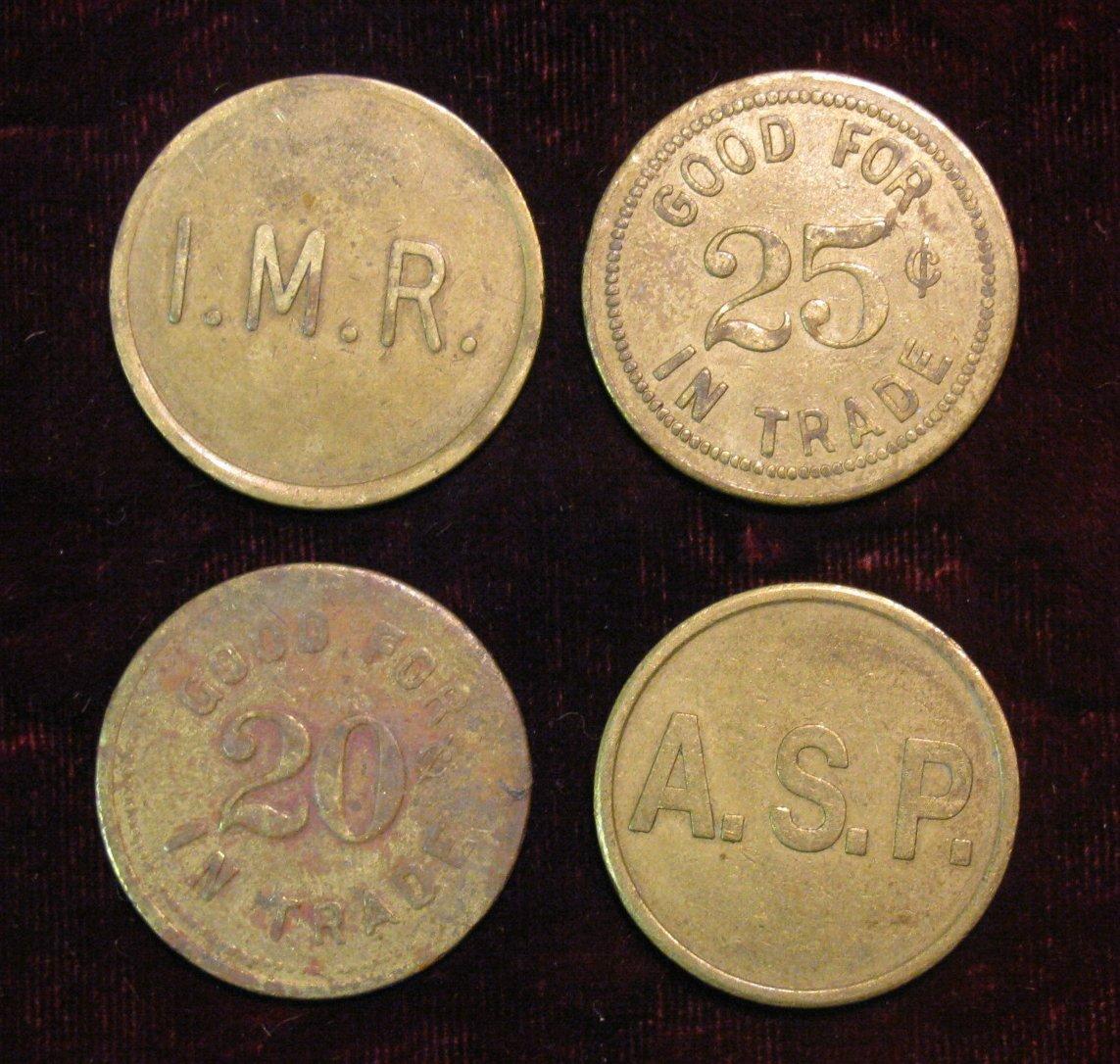 567. Four-Piece Set of Anamosa State Prison Tokens. Includes "A.S.P.", "I.M.R.", "Good for .20c", & "Good For .25c".