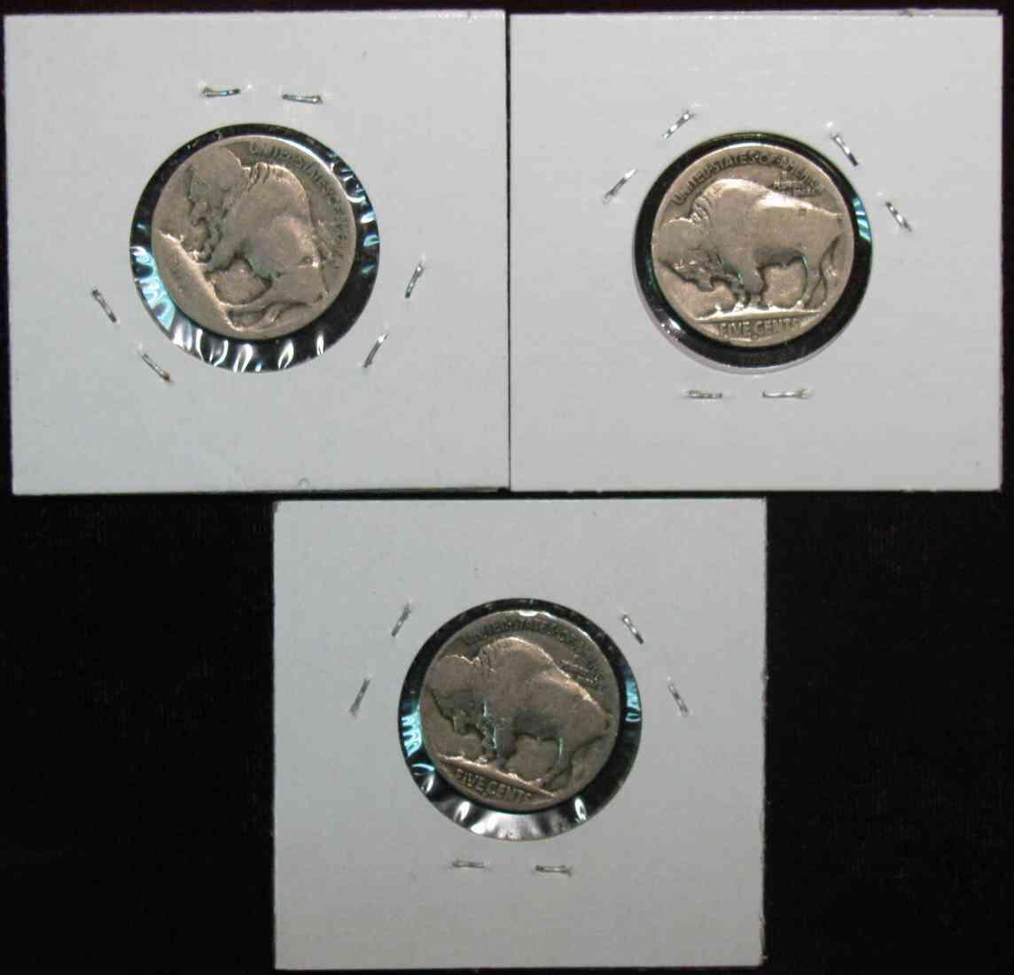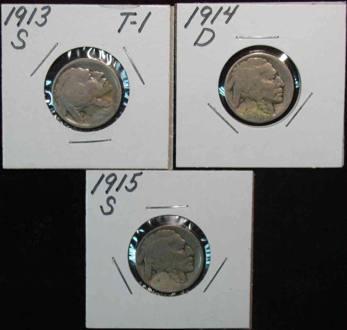 568. 1913S T.1, 14D, & 15S Buffalo Nickels. Restored dates. G-4 Redbook is $160.00.