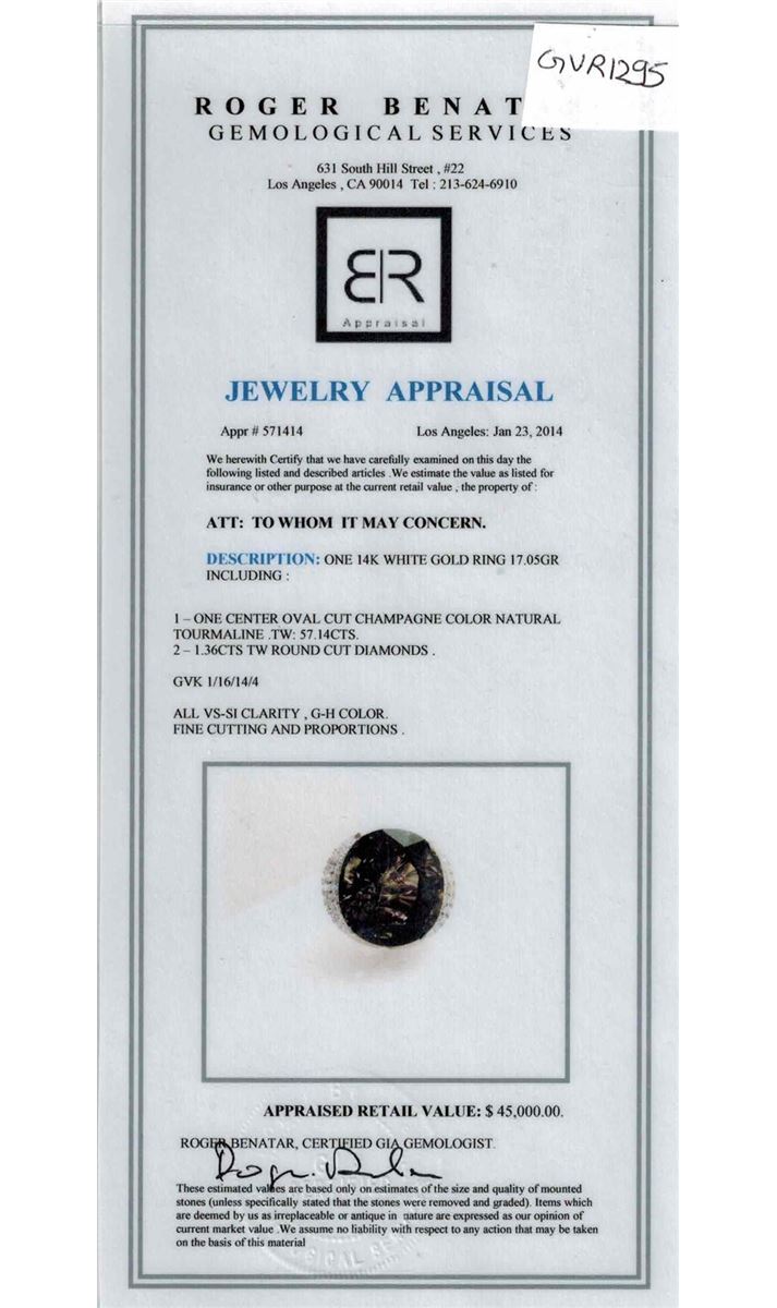 14K W/G NATURAL TOURMALINE RING: 17.05GRAM/TOURMALINE :57.15CT/ DIAMOND RD :1.36CT/#GVR1295