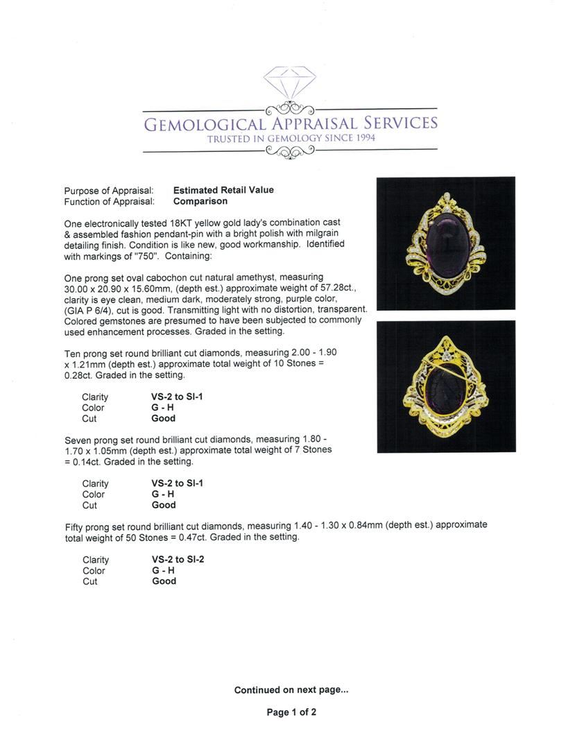 One electronically tested 18KT yellow gold lady's combination cast & assembled fashion pendant-pin with a bright polish with milgrain detailing finish. Identified with markings of '750'. Condition is like new, good workmanship. Containing: One prong set oval cabochon cut natural amethyst, measuring 30.00 x 20.90 x 15.60mm, (depth est.) approximate weight of 57.28ct., clarity is eye clean, medium dark, moderately strong, purple color, (GIA P 6/4), cut is good. Transmitting light with no distortion, transparent. Colored gemstones are presumed to have been subjected to commonly used enhancement processes. Graded in the setting. Ten prong set round brilliant cut diamonds, measuring 2.00 - 1.90 x 1.21mm (depth est.) approximate total weight of 10 Stones = 0.28ct. Graded in the setting. Color G - H Clarity VS-2 to SI-1 Cut Good Seven prong set round brilliant cut diamonds, measuring 1.80 - 1.70 x 1.05mm (depth est.) approximate total weight of 7 Stones = 0.14ct. Graded in the setting. Color G - H Clarity VS-2 to SI-1 Cut Good Fifty prong set round brilliant cut diamonds, measuring 1.40 - 1.30 x 0.84mm (depth est.) approximate total weight of 50 Stones = 0.47ct. Graded in the setting. Color G - H Clarity VS-2 to SI-2 Cut Good. Total Weight of Colored Stones 57.28ct.. Total Weight of Diamonds 0.89ct.. Total Weight of Pendant-Pin 24.20gm. GAS Appraised at $6,800.00.