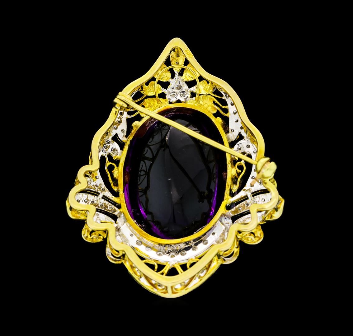 One electronically tested 18KT yellow gold lady's combination cast & assembled fashion pendant-pin with a bright polish with milgrain detailing finish. Identified with markings of '750'. Condition is like new, good workmanship. Containing: One prong set oval cabochon cut natural amethyst, measuring 30.00 x 20.90 x 15.60mm, (depth est.) approximate weight of 57.28ct., clarity is eye clean, medium dark, moderately strong, purple color, (GIA P 6/4), cut is good. Transmitting light with no distortion, transparent. Colored gemstones are presumed to have been subjected to commonly used enhancement processes. Graded in the setting. Ten prong set round brilliant cut diamonds, measuring 2.00 - 1.90 x 1.21mm (depth est.) approximate total weight of 10 Stones = 0.28ct. Graded in the setting. Color G - H Clarity VS-2 to SI-1 Cut Good Seven prong set round brilliant cut diamonds, measuring 1.80 - 1.70 x 1.05mm (depth est.) approximate total weight of 7 Stones = 0.14ct. Graded in the setting. Color G - H Clarity VS-2 to SI-1 Cut Good Fifty prong set round brilliant cut diamonds, measuring 1.40 - 1.30 x 0.84mm (depth est.) approximate total weight of 50 Stones = 0.47ct. Graded in the setting. Color G - H Clarity VS-2 to SI-2 Cut Good. Total Weight of Colored Stones 57.28ct.. Total Weight of Diamonds 0.89ct.. Total Weight of Pendant-Pin 24.20gm. GAS Appraised at $6,800.00.
