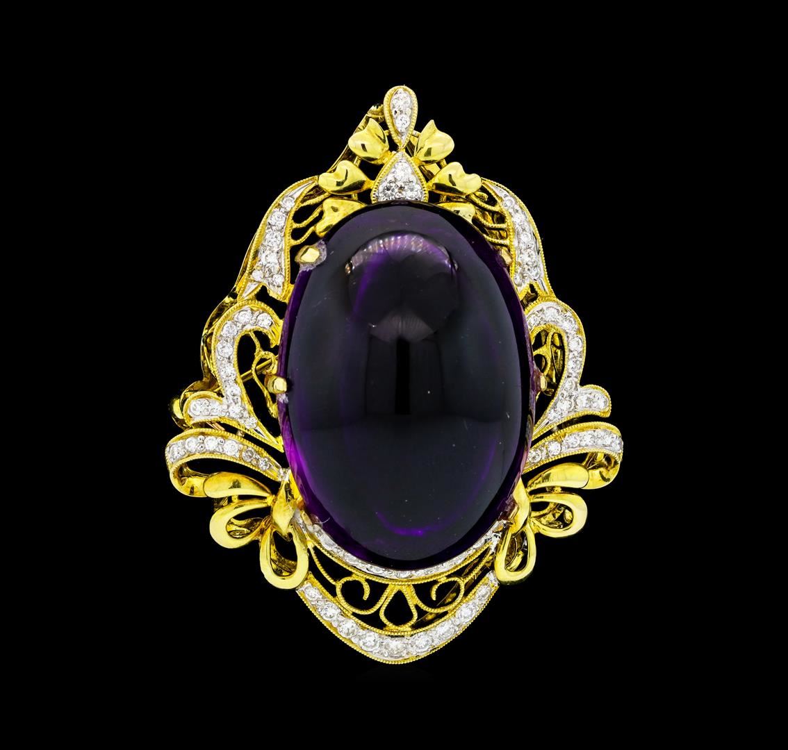 One electronically tested 18KT yellow gold lady's combination cast & assembled fashion pendant-pin with a bright polish with milgrain detailing finish. Identified with markings of '750'. Condition is like new, good workmanship. Containing: One prong set oval cabochon cut natural amethyst, measuring 30.00 x 20.90 x 15.60mm, (depth est.) approximate weight of 57.28ct., clarity is eye clean, medium dark, moderately strong, purple color, (GIA P 6/4), cut is good. Transmitting light with no distortion, transparent. Colored gemstones are presumed to have been subjected to commonly used enhancement processes. Graded in the setting. Ten prong set round brilliant cut diamonds, measuring 2.00 - 1.90 x 1.21mm (depth est.) approximate total weight of 10 Stones = 0.28ct. Graded in the setting. Color G - H Clarity VS-2 to SI-1 Cut Good Seven prong set round brilliant cut diamonds, measuring 1.80 - 1.70 x 1.05mm (depth est.) approximate total weight of 7 Stones = 0.14ct. Graded in the setting. Color G - H Clarity VS-2 to SI-1 Cut Good Fifty prong set round brilliant cut diamonds, measuring 1.40 - 1.30 x 0.84mm (depth est.) approximate total weight of 50 Stones = 0.47ct. Graded in the setting. Color G - H Clarity VS-2 to SI-2 Cut Good. Total Weight of Colored Stones 57.28ct.. Total Weight of Diamonds 0.89ct.. Total Weight of Pendant-Pin 24.20gm. GAS Appraised at $6,800.00.