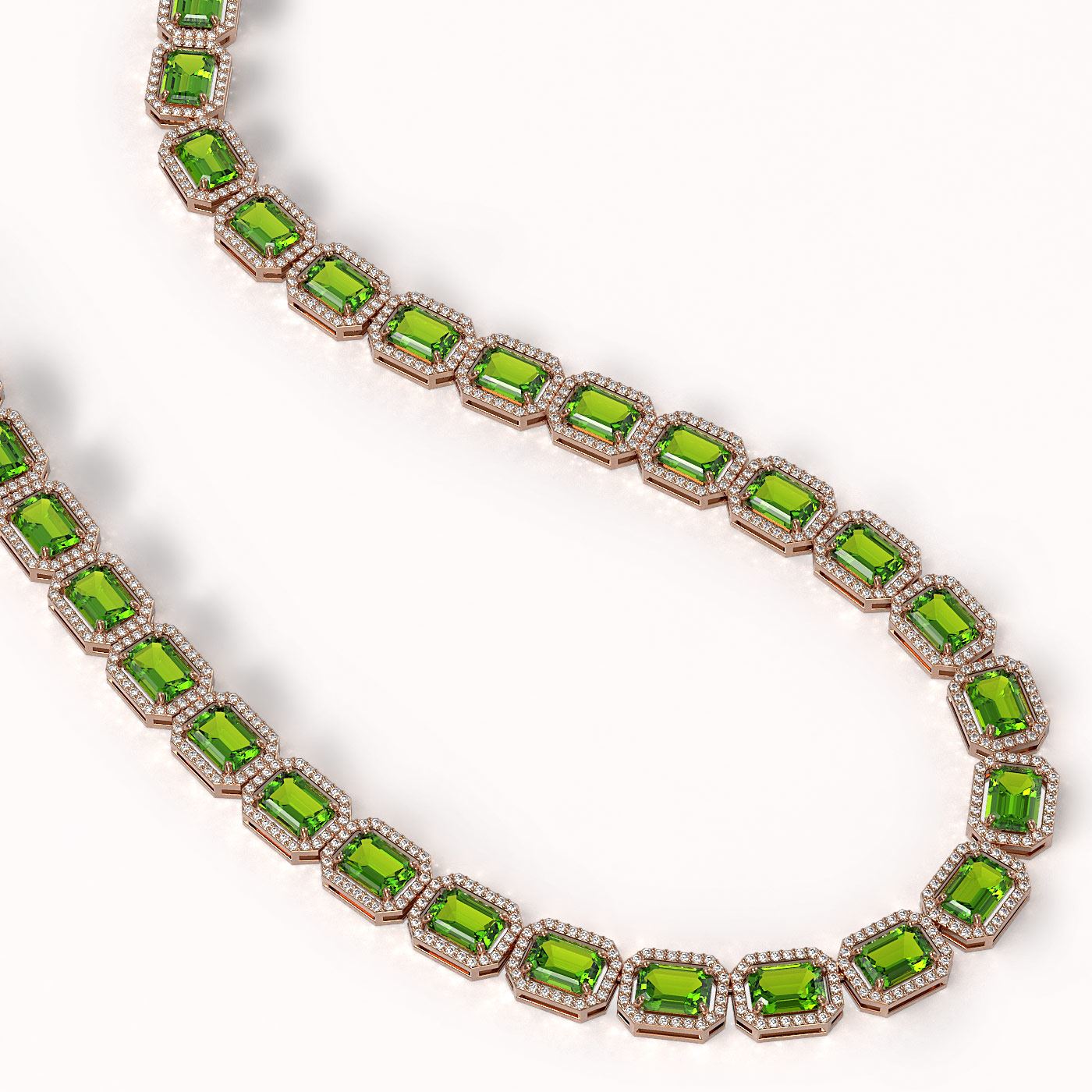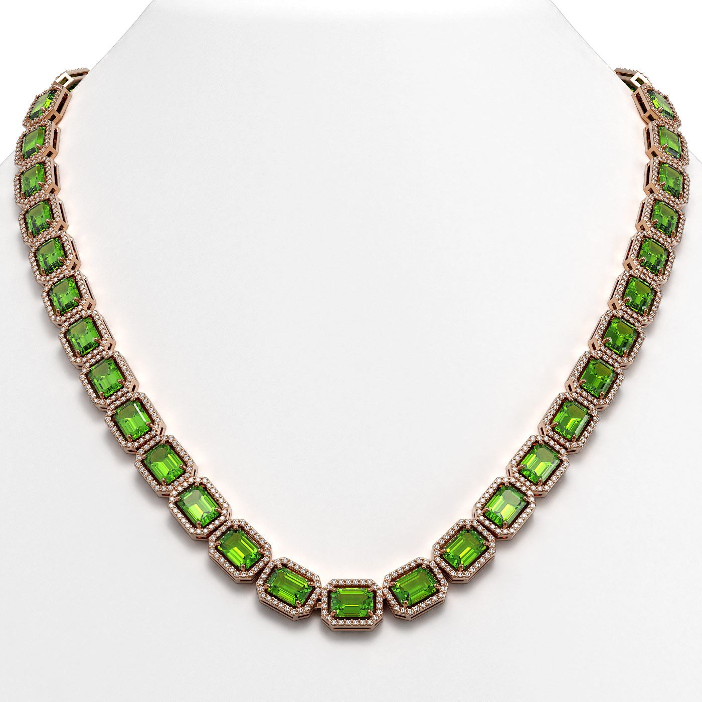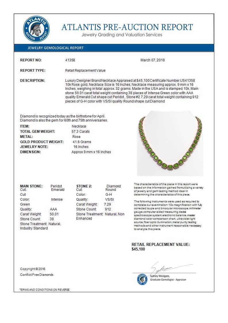 REF-819T6M -41358 ---- 57.3 CTW Peridot & Diamond Halo Necklace 10K Rose Gold ---- Luxury Designer Brand Necklace Appraised at $45,100 Certificate Number US41358 10k Rose gold, Necklace Size is 16 Inches, Necklace measuring approx. 9 mm x 16 Inches, weighing in total approx. 32 grams. Made in the USA and is stamped 10k, Main stone 50.01 carat total weight containing 38 pieces of Intense Green color with AAA quality Emerald Cut shape cut Peridot , Stone #2 7.29 carat total weight containing 912 pieces of G-H color with VS/SI quality Round shape cut Diamond