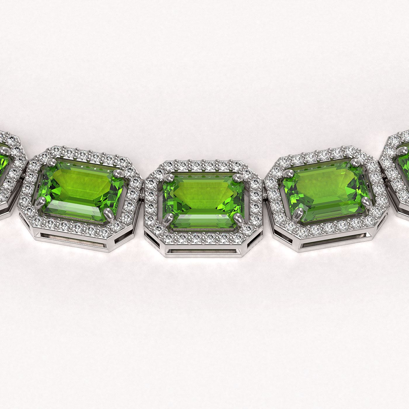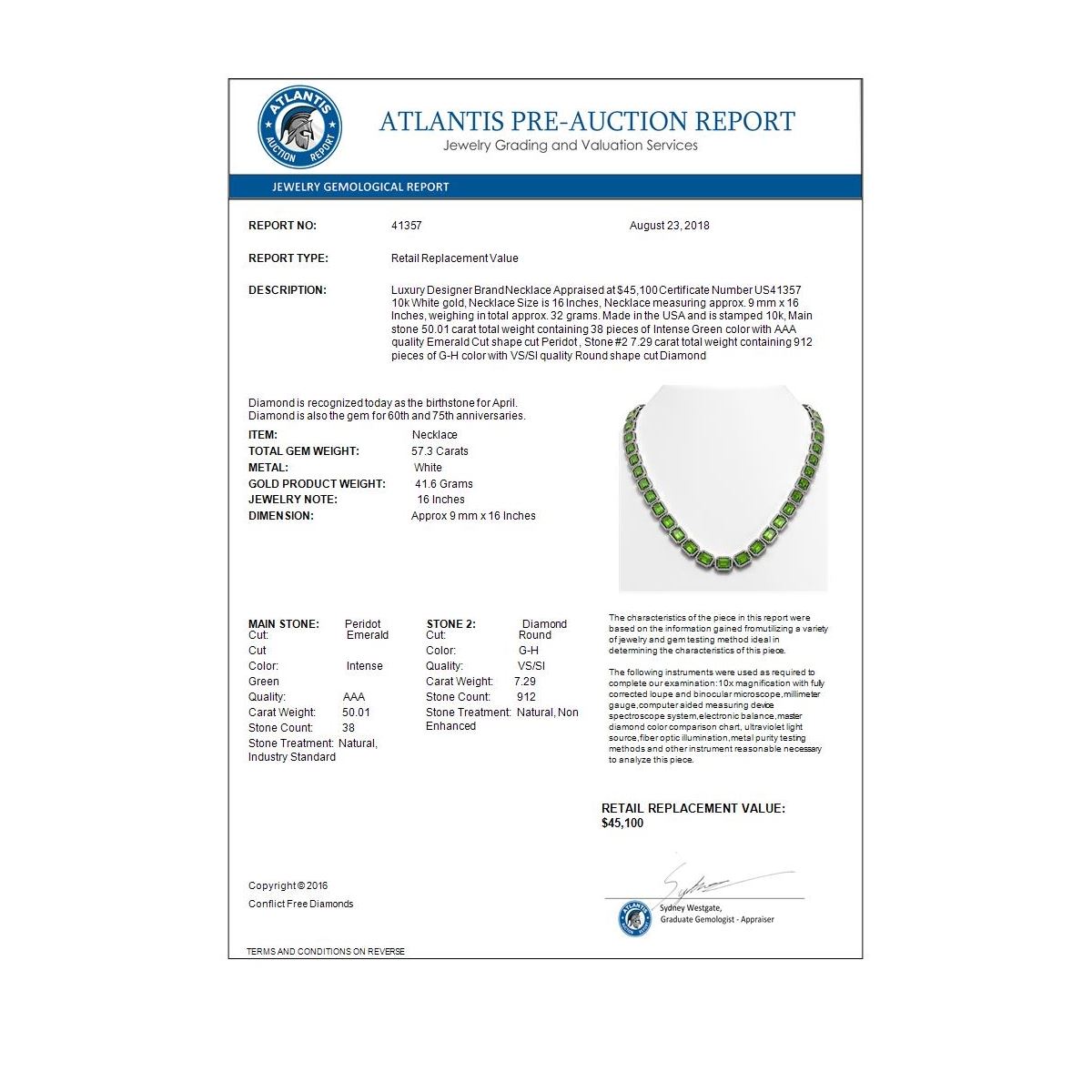 REF-819A6X -41357 ---- 57.3 CTW Peridot & Diamond Halo Necklace 10K White Gold ---- Luxury Designer Brand Necklace Appraised at $45,100 Certificate Number US41357 10k White gold, Necklace Size is 16 Inches, Necklace measuring approx. 9 mm x 16 Inches, weighing in total approx. 32 grams. Made in the USA and is stamped 10k, Main stone 50.01 carat total weight containing 38 pieces of Intense Green color with AAA quality Emerald Cut shape cut Peridot , Stone #2 7.29 carat total weight containing 912 pieces of G-H color with VS/SI quality Round shape cut Diamond