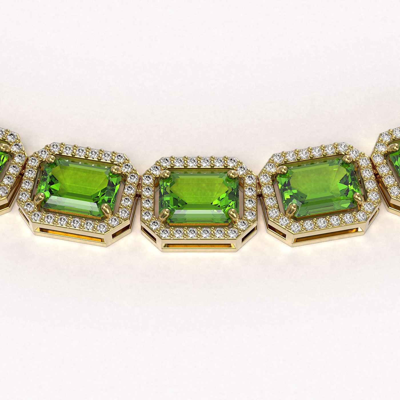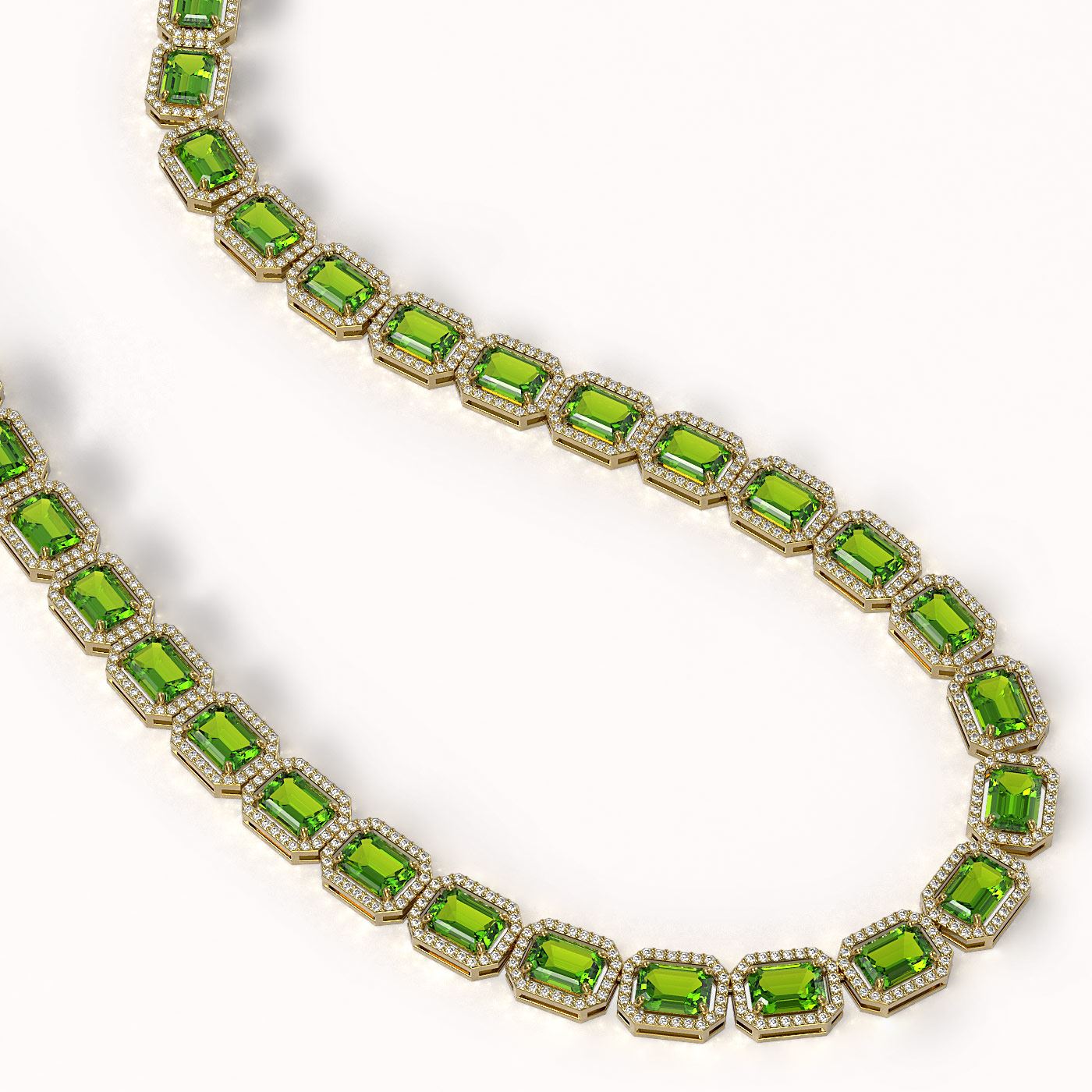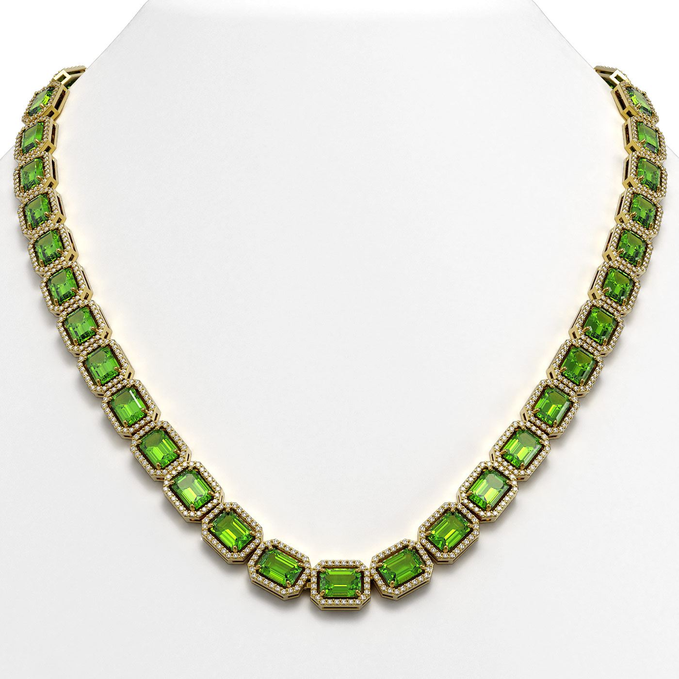 REF-819M6H -41359 ---- 57.3 CTW Peridot & Diamond Halo Necklace 10K Yellow Gold ---- Luxury Designer Brand Necklace Appraised at $45,100 Certificate Number US41359 10k Yellow gold, Necklace Size is 16 Inches, Necklace measuring approx. 9 mm x 16 Inches, weighing in total approx. 32 grams. Made in the USA and is stamped 10k, Main stone 50.01 carat total weight containing 38 pieces of Intense Green color with AAA quality Emerald Cut shape cut Peridot , Stone #2 7.29 carat total weight containing 912 pieces of G-H color with VS/SI quality Round shape cut Diamond