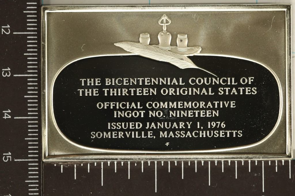 OF THE 13 ORIGINAL STATES OFFICIAL COMMEMORATIVE INGOT NUMBER 19 ISSUED ON JAN. 1, 1976 SOMERVILLE, MASSACHUSETTS, PROOF, EDGE MARKED
