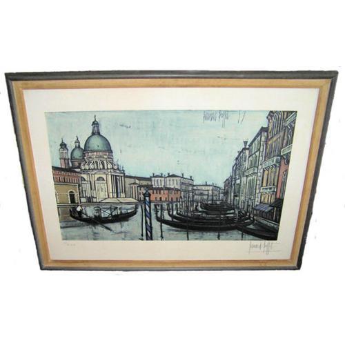 This large offset lithograph with pochoir by Bernard Buffet (1928-1999) dates from 1957 and is commonly known simply as "Venise" or "Venise (Grand Canal)". It depicts the Santa Maria Della Salute cathedral in Venice, on the opposite side of the Grand Canal from St. Mark's Square and near the triangular tip of the Dorsoduro quarter. (Pochoir is the hand-coloring process of black outline prints using zinc or copper stencil guides where the individual colors are added one at a time using watercolor and/or gouache.) Purchased in its current state (framed) from the prestigious Newman Galleries of Philadelphia in the 1960s. Newman label remains on the rear of the frame. Signed "H.C. 10/20" near the Spitzer blindstamp in the lower left corner. This is an Hors d' Commerce Proof used by the artist and/or his representative to market the numbered prints to dealers. Signed by the artist and dated "57" in the plate in the upper right. Published by Guy Spitzer of Paris. Signed by the artist in pencil in the lower right margin. Frame measures 33.25" x 45". Plate measures 21.75" x 36" and exposed print (visible inside matting) measures 28.75" x 41". Condition is excellent. Weighs approximately 20-25 lbs. We have not examined the print outside of its frame.
