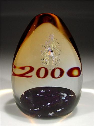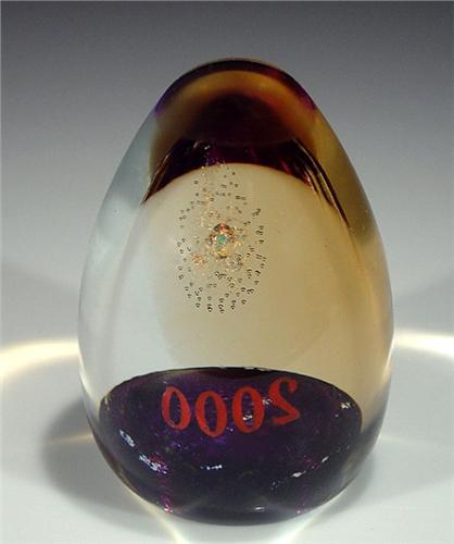 Caithness Glass "Millennium Starburst" high-domed paperweight, with dichroic bubbles depicting fireworks, above a translucent amethyst cushion. The numerals "2000" float in the background. Signed. Limited edition #68 of 650. Height 3 3/4". NO RESERVE