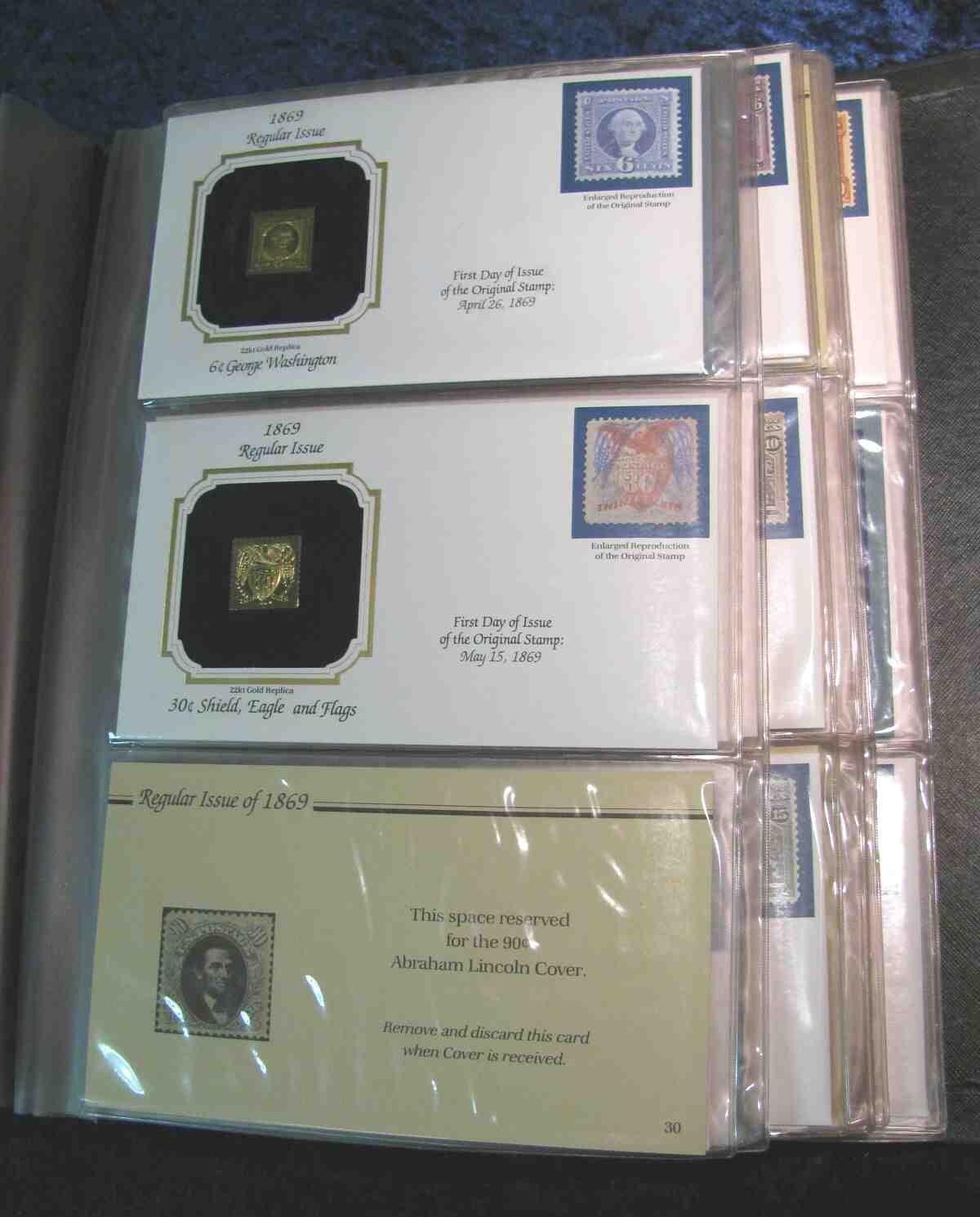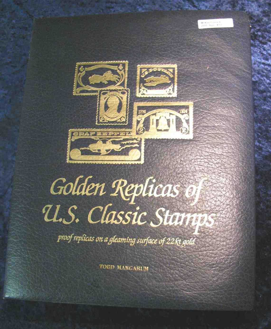 57. Large Simulated Leather Bound Album titled "Golden Replicas of U.S. Classic Stamps" Proof replicas on a gleaming surface of 22K gold. Features 61 different covers which, originally sold for $6.25 each. Total value $381.25. Includes the super rare 1930 Graf Zeppelin issues & the inverted Jennie.