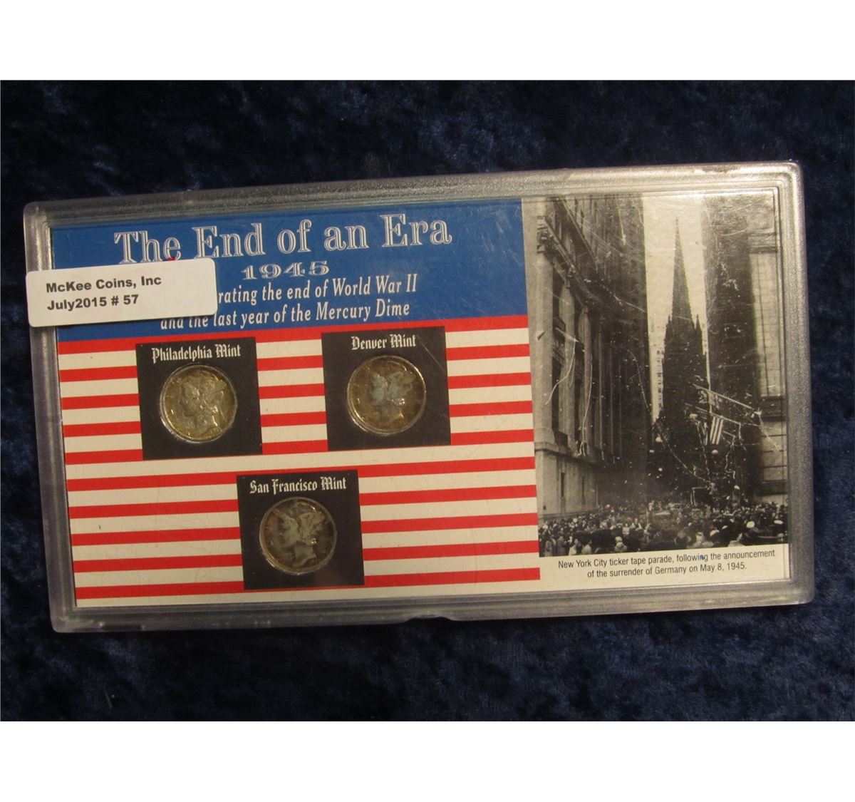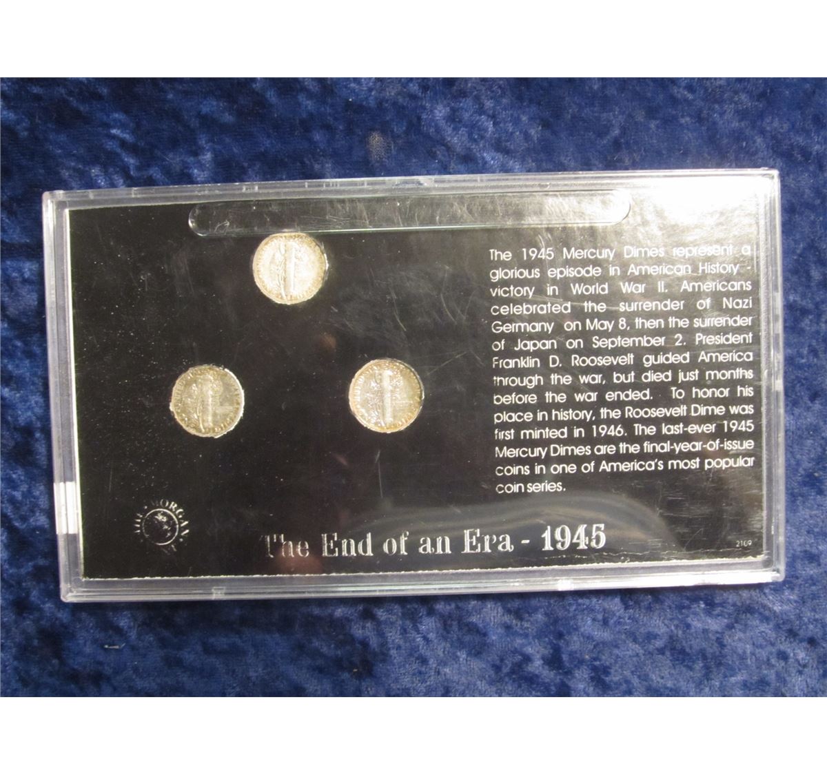 57. "The End of an era 1945 Commemorating the end of WW II and the last year of the Mercury Dime" plastic case with (3) Silver Mercury Dimes.