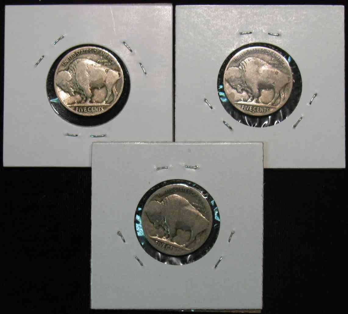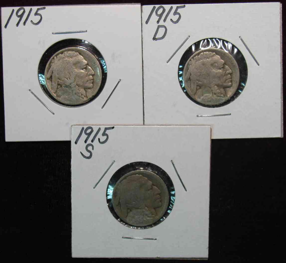 570. 1915P, D, & S Buffalo Nickels. Restored dates. G-4 Redbook is $63.00