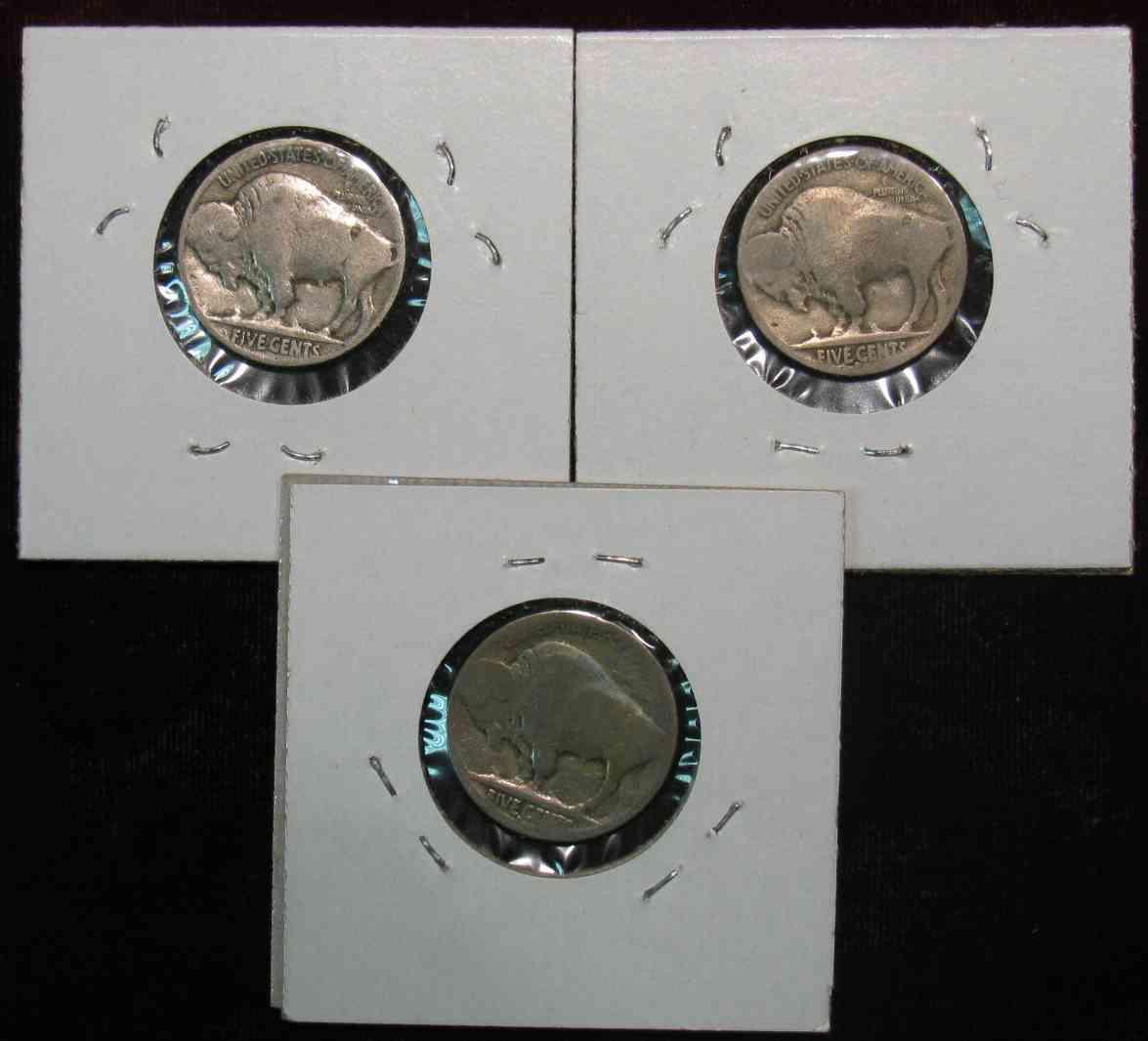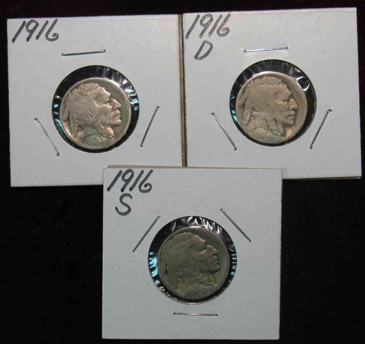571. 1916P, D, & S Buffalo Nickels. Restored dates. G-4 Redbook is $27.00