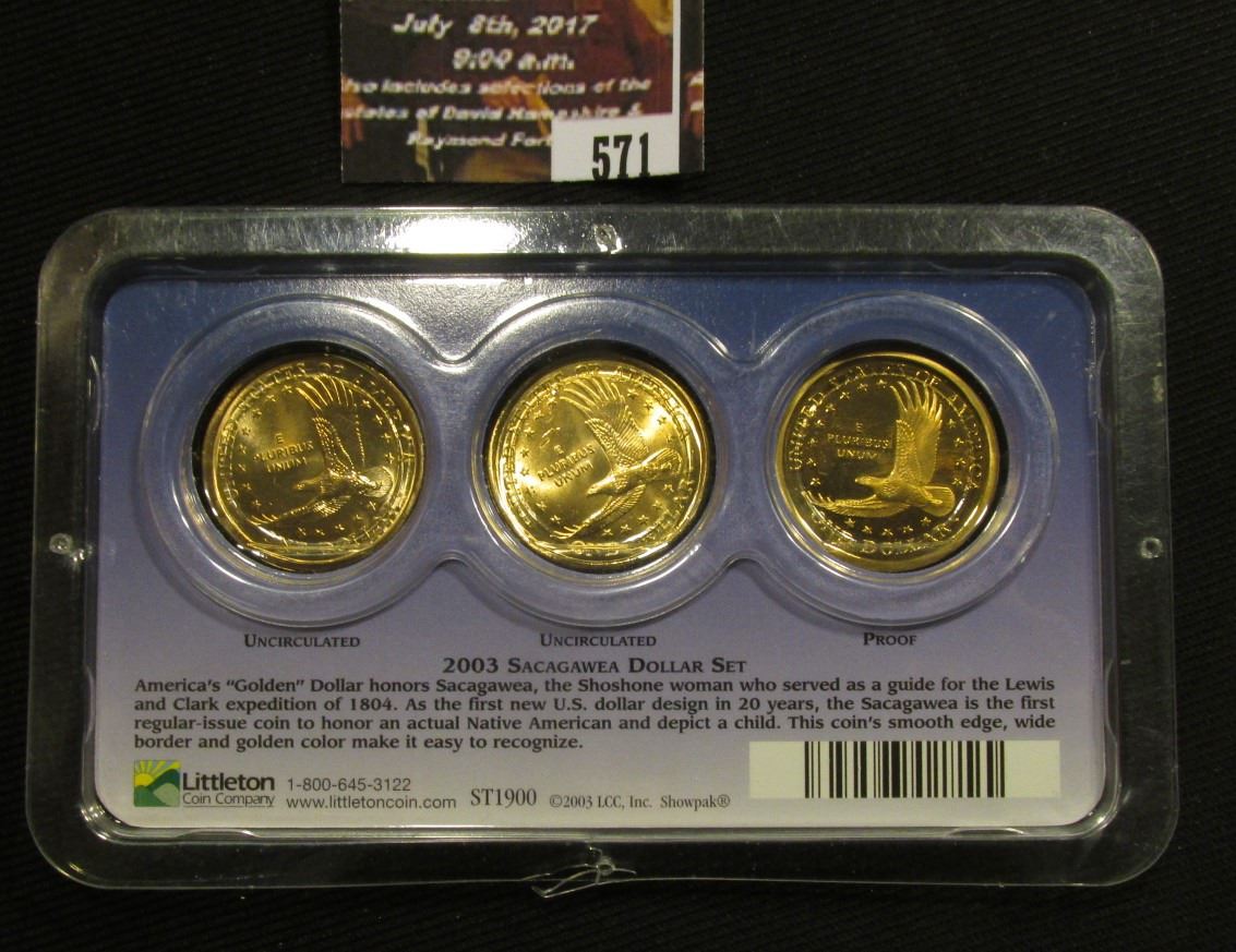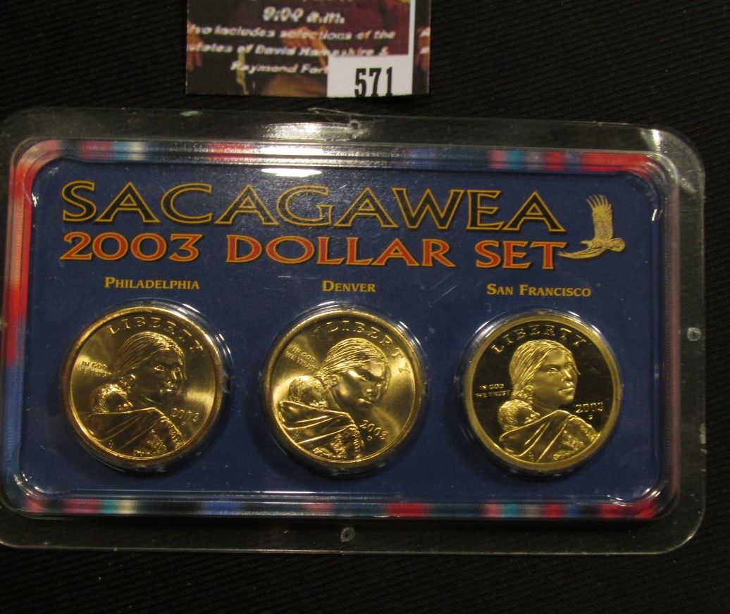 571.2003 P, D, & S Sacagawea Three-Piece Dollar Set, includes a spectacular Proof issue.
