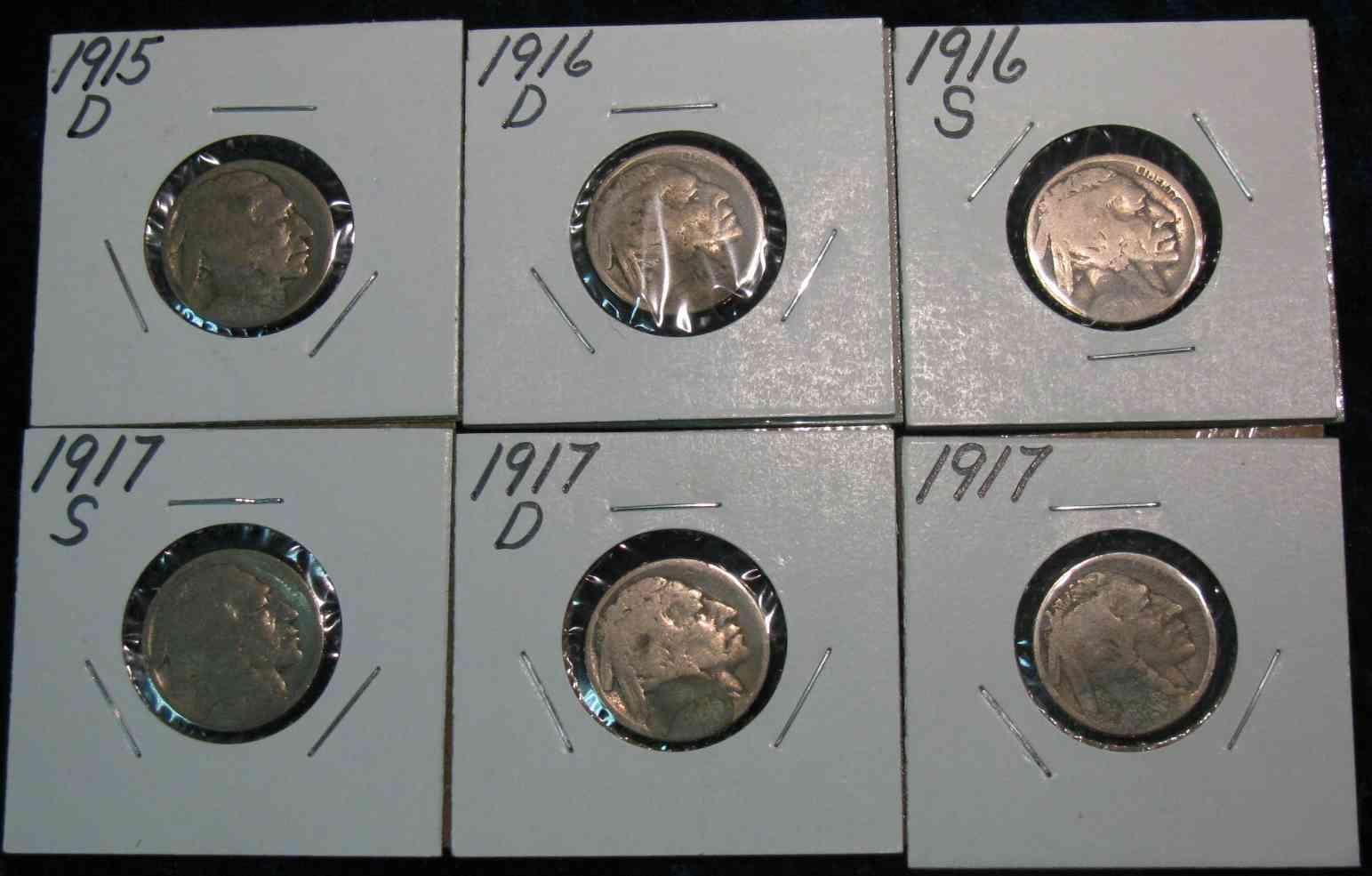 572. 1915D, 16D, S, 17P, D, & S Buffalo Nickels. Restored dates.