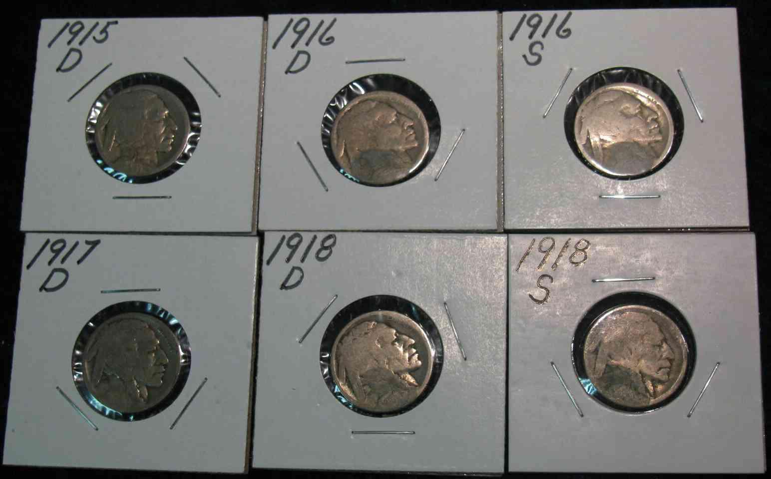 573. 1915D, 16D, S, 17D, 18D, & S Buffalo Nickels. Restored dates.