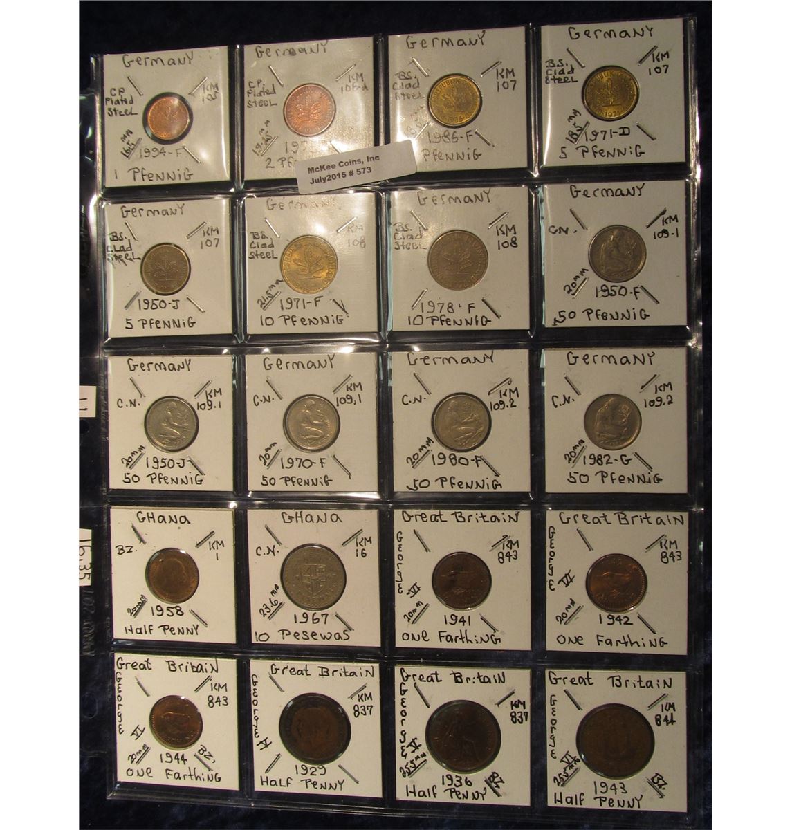 573. (20) World Coins in Plastic page, all identified and in 2" x 2" holders. Includes: Germany, Ghana, & Great Britain. KM Catalog Value $16.35.