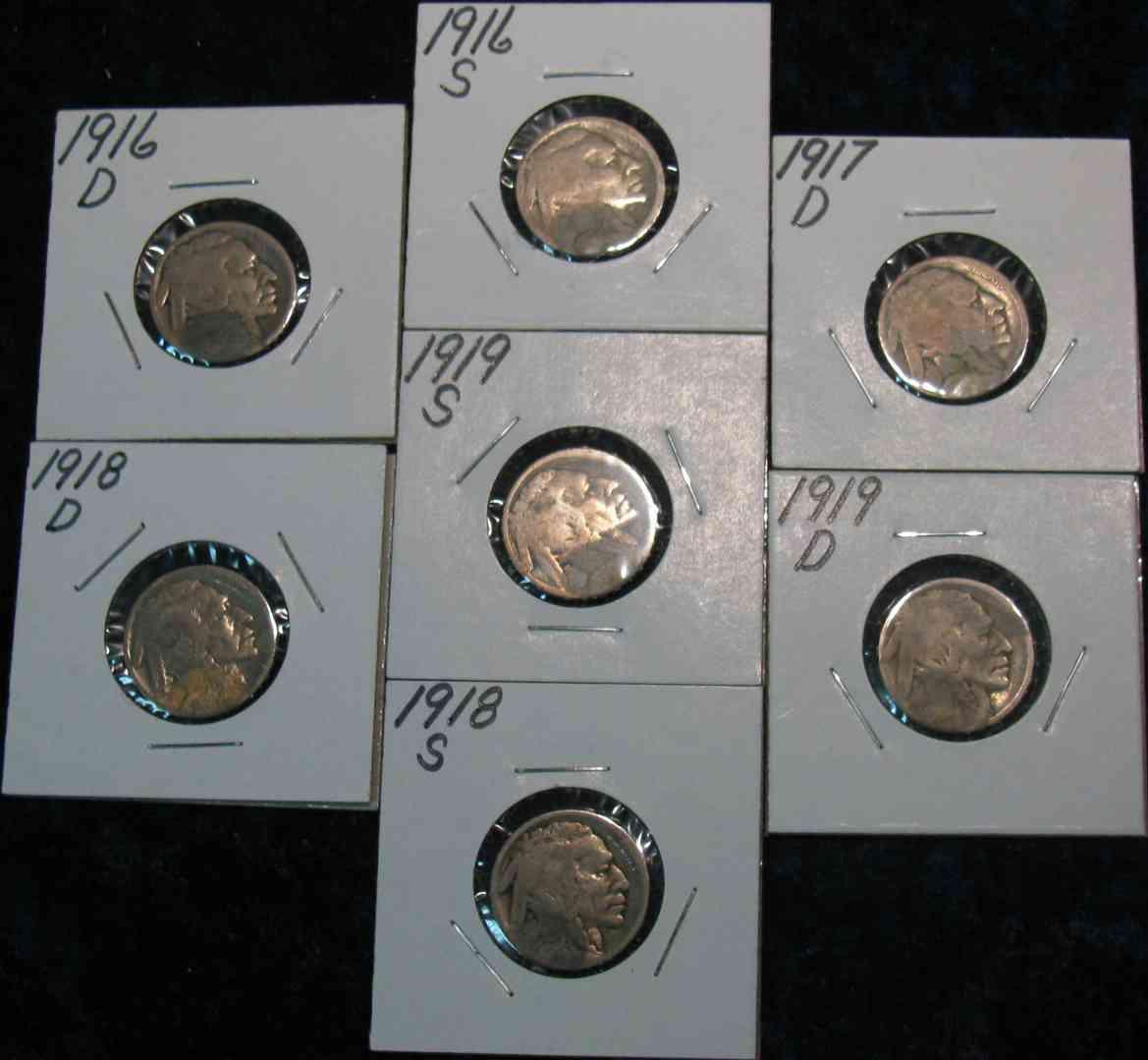 575. 1916D, S, 17D, 18D, S, 19D, & S Buffalo Nickels. Restored dates.