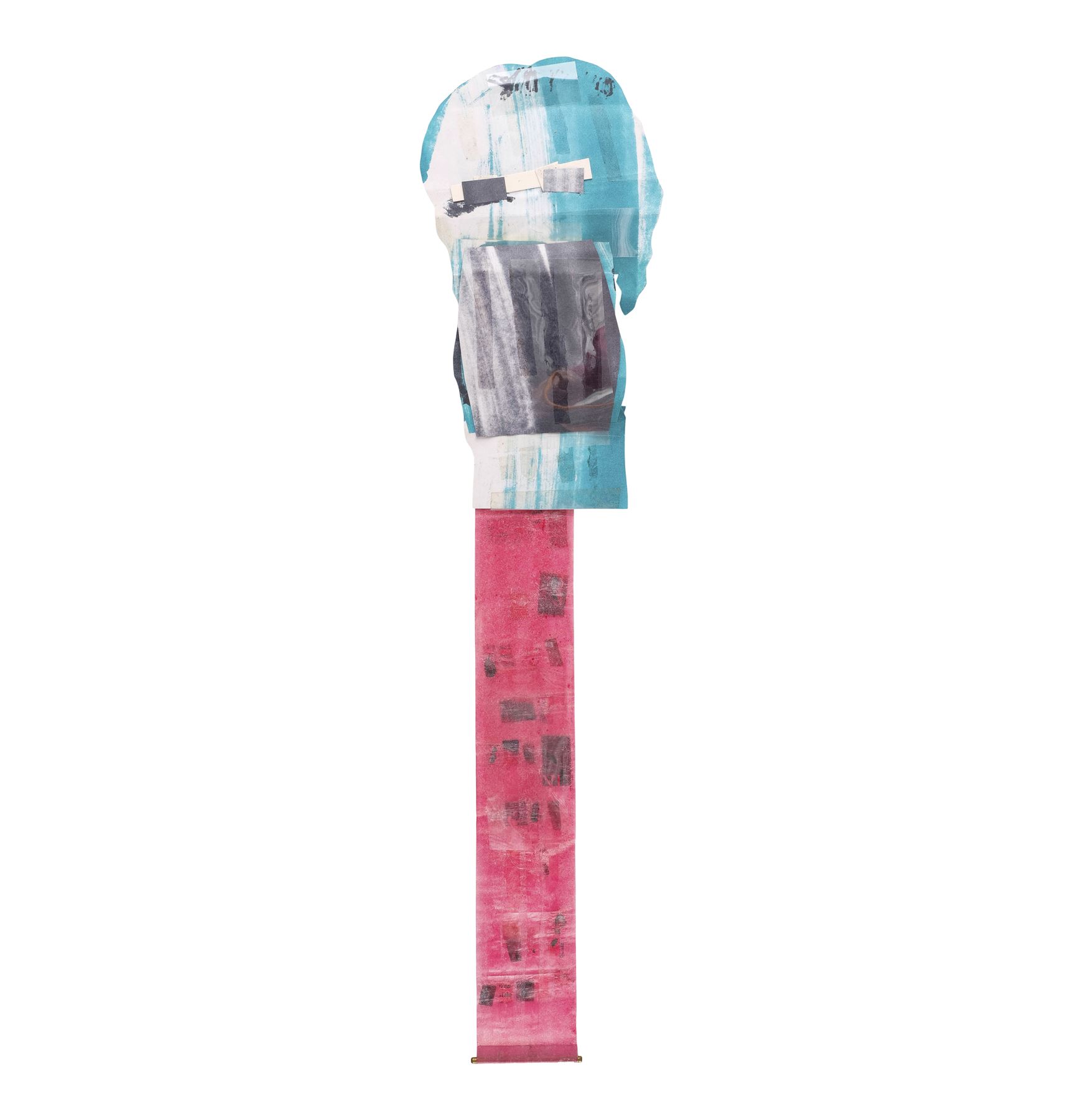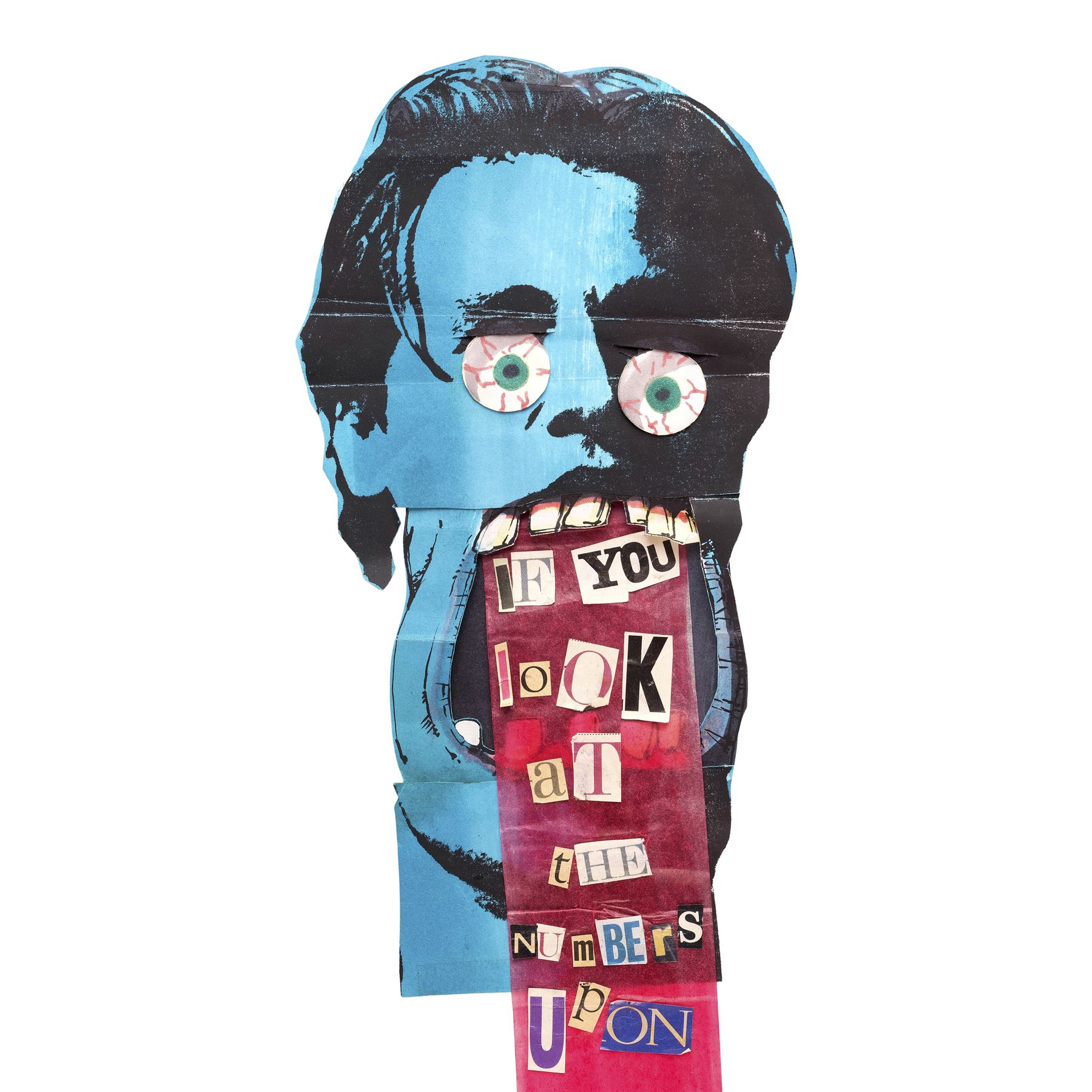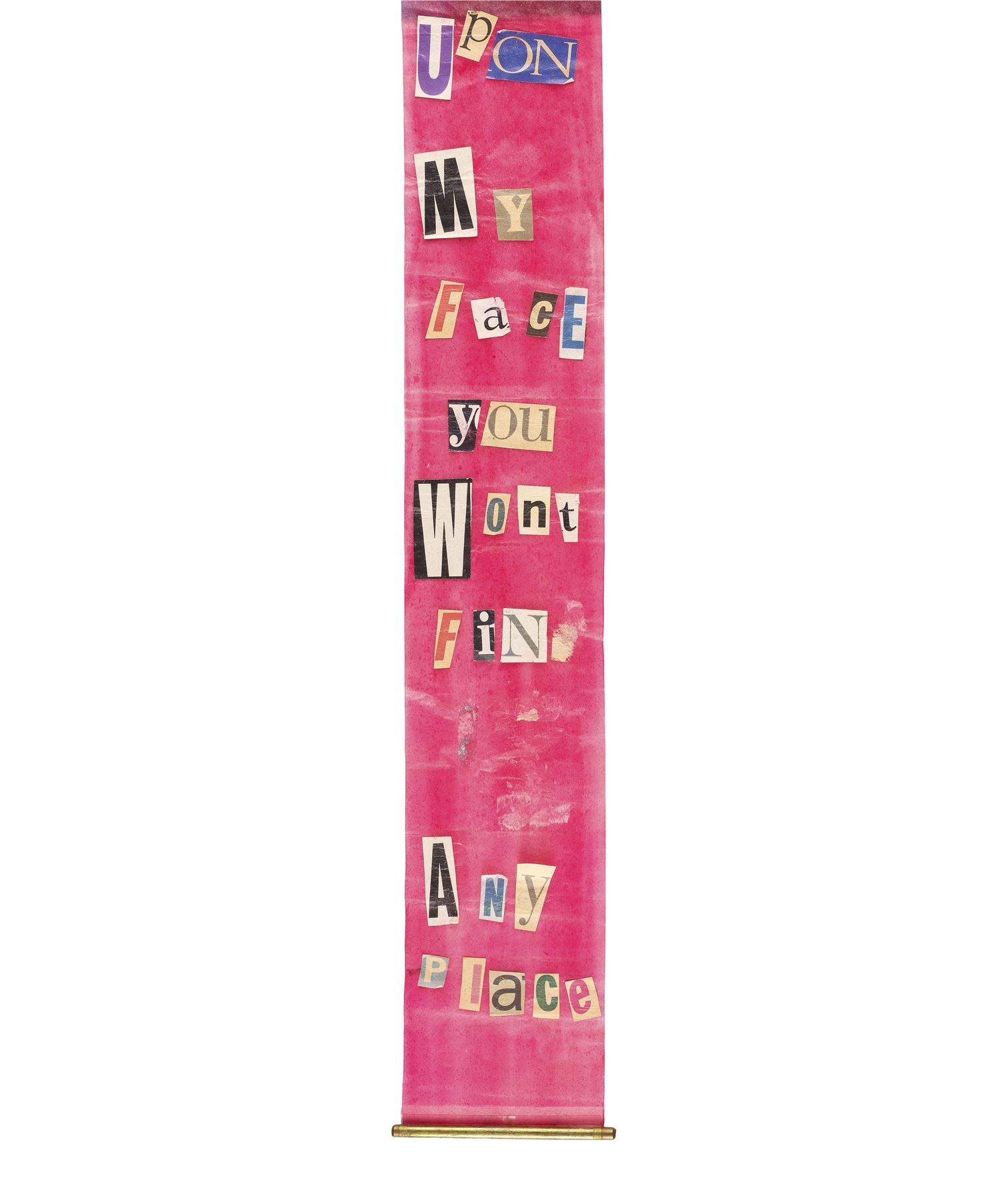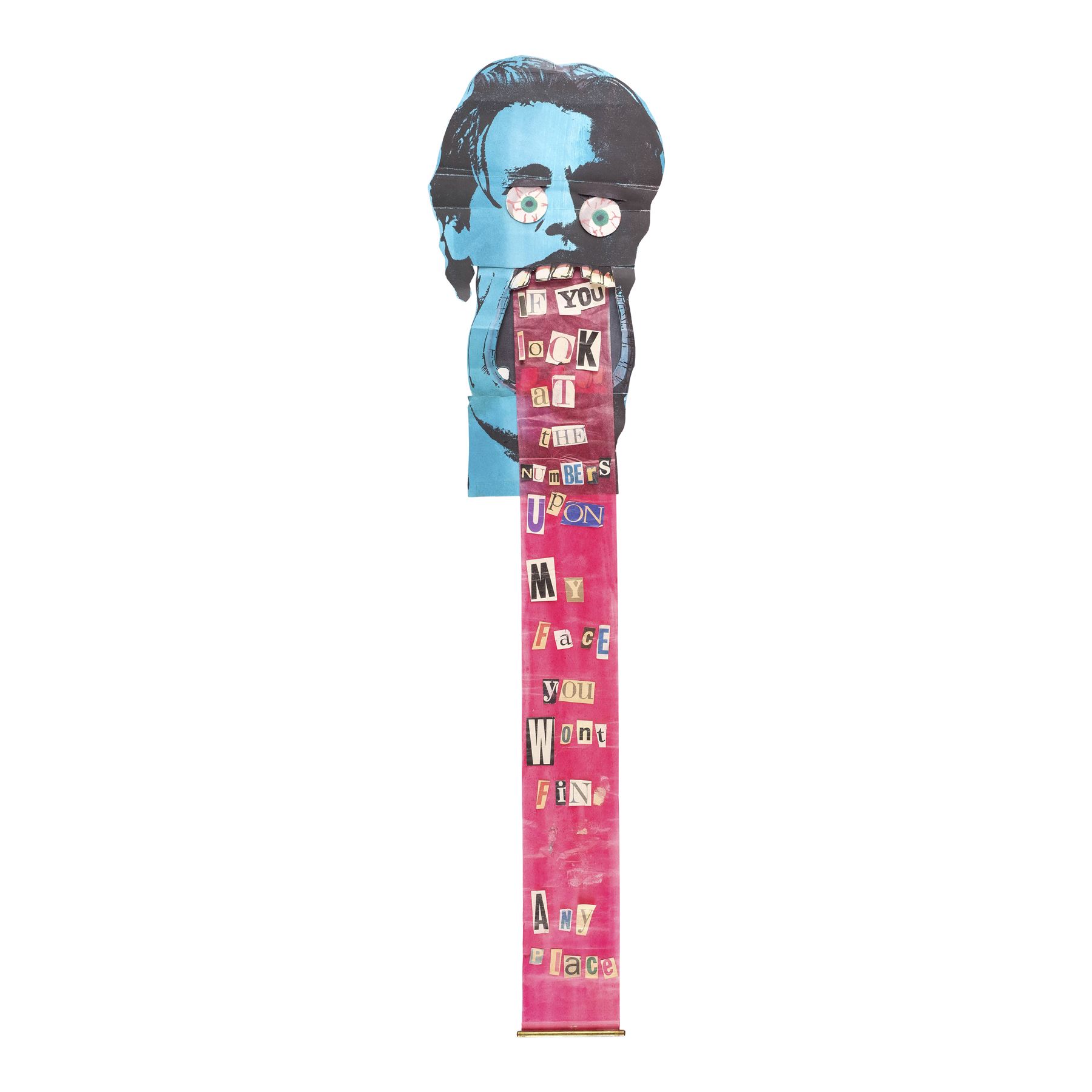 This prototype is made of a blue paper insert of Bruce Wayne's face with eyes adhered over it and a red paper roll attached from the mouth with cut-out letters and a metal bar at the end. This lot exhibits fragile paper sections and glue residue from missing letter cut-outs. Dimensions: 20.5" x 5" x 0.25" (52 cm x 12.75 cm x 0.75 cm)